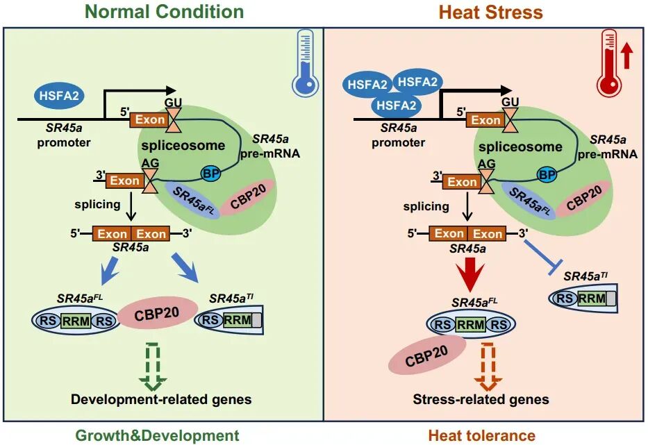 山东农业大学生命科学学院颜康/郑成超课题组揭示分支位点介导的SR45a可变剪接调控植物耐热性的新机制