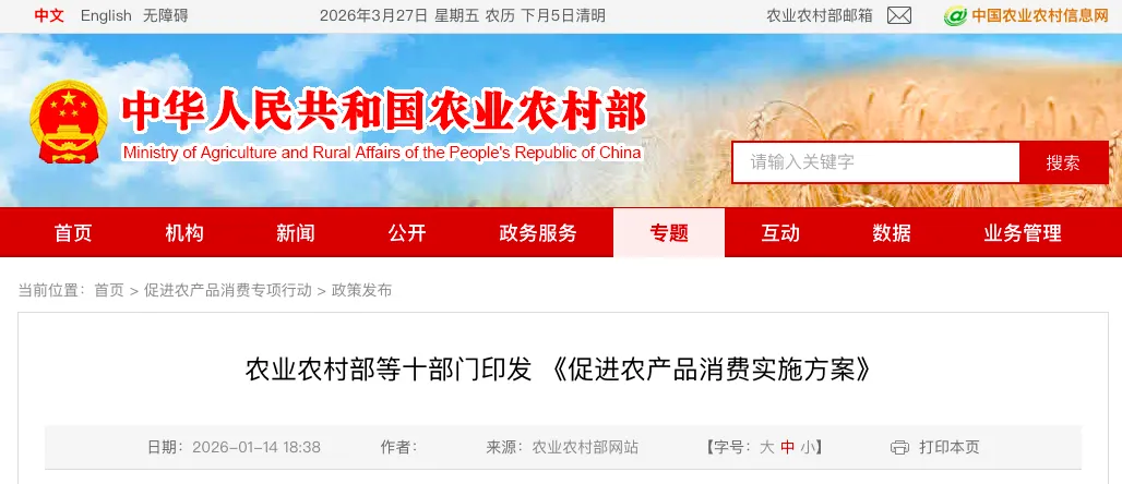 为深入贯彻中共中央办公厅、国务院办公厅印发的《提振消费专项行动方案》部署要求,有力有效扩大农产品消费,优化供给端、创新流通端、激活市场端,释放多样化、品质化、差异化消费潜力,引领供需结构升级,现就促进农产品消费制定本方案。
