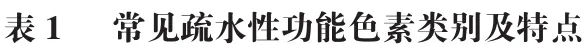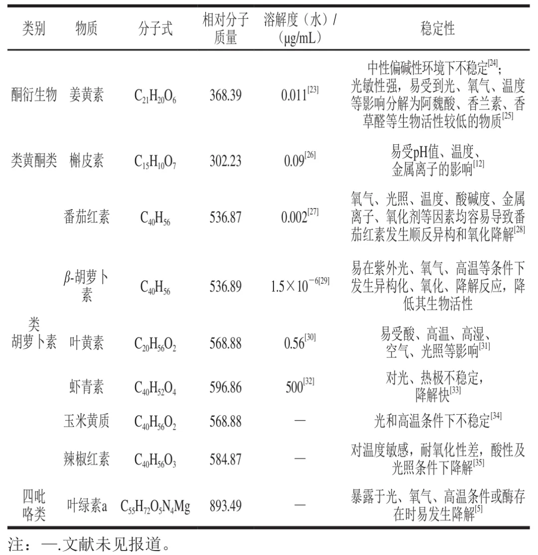 疏水性功能色素是一类具有低极性化学结构、在水中溶解度较低的天然来源色素,广泛分布于植物、动物及微生物中。这类色素主要包括酮衍生物、类黄酮类、类胡萝卜素及四吡咯类等(图1、表1)。姜黄素是酮衍生物中典型的疏水性功能色素之一,呈橙、黄色,分子结构以芳香环和共轭链为主,有优异的着色性能和高生物活性,但在水中溶解度仅为0.011 µg/mL。类黄酮中疏水性功能色素主要包括槲皮素,其是一类来源于植物、呈黄色的天然次生代谢产物,分子结构含两个苯环,苯环上的羟基使其表现出多种生理活性,如预防或降低癌症、心血管病、糖尿病和神经系统疾病的风险,可用作兼具健康效益和着色的功能活性成分。类胡萝卜素是一类由植物、藻类及某些真菌和非光合细菌合成的呈红、橙或黄色的脂溶性色素,根据分子结构是否存在含氧基团,主要分为胡萝卜素类(番茄红素、β-胡萝卜素)和叶黄素类(叶黄素、虾青素等)。不同的空间构型和官能团修饰赋予了类胡萝卜素多样的生物学效应,主要包括抗氧化、抗炎及抗肿瘤,同时在免疫调节、视觉保护等方面表现出潜在的功能作用,但异戊二烯单元构成的长链多烯烃结构使其易被氧化或发生异构化,光、热条件下易降解。叶绿素是一类由亲水卟啉环和疏水性植醇基构成的四吡咯色素,呈鲜艳绿色并具有抗氧化、抗菌等生物活性,但植醇基赋予的疏水性和分子结构的不稳定性(如光敏性及热敏性)使其易降解及褪色,大大限制了其在相关产品中的利用效率和健康功效发挥。因此,提高疏水性功能色素在水中的分散性及加工条件稳定性等已成为突破现有应用限制,拓展其在食品着色剂、营养保健品、化妆品及医药等领域应用的关键。