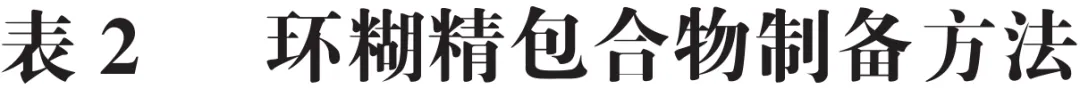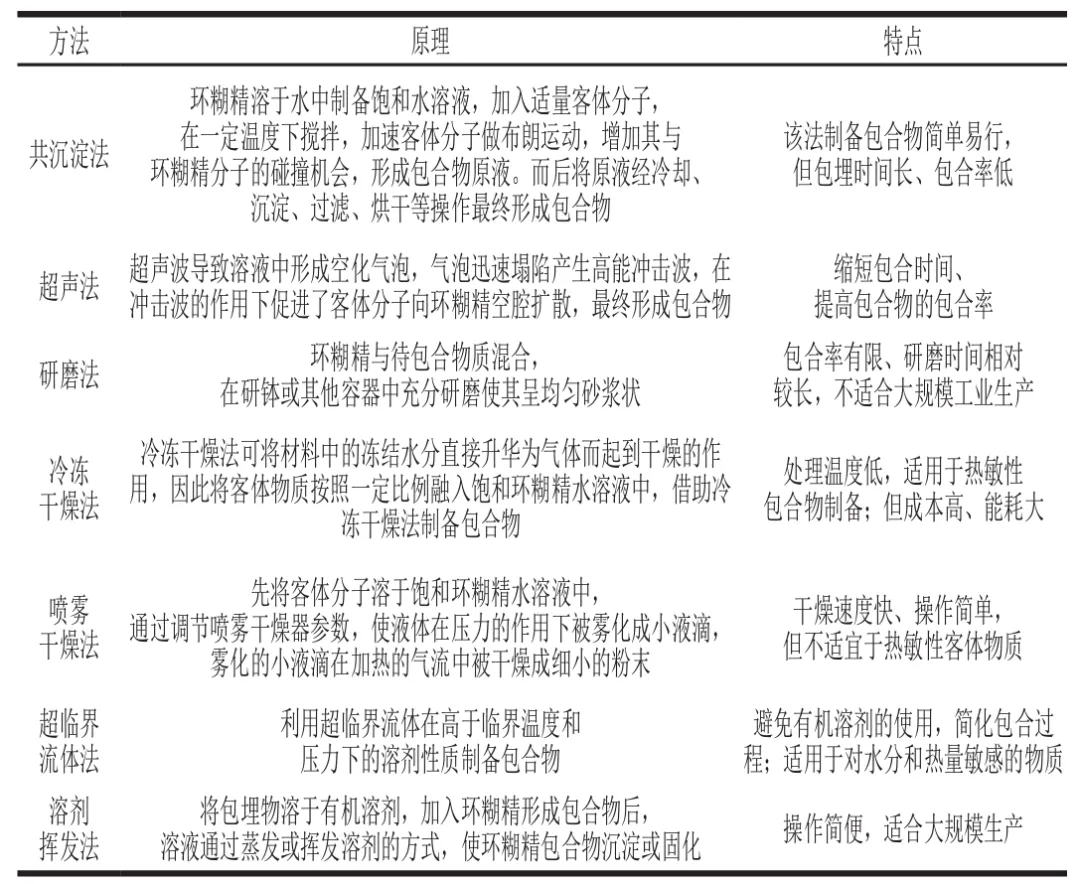 包合技术是指在一定条件下,将客体分子嵌入主体分子空穴内形成超微囊状包合物的技术。主体分子是指具有空穴结构且可容纳客体分子的包合材料,而客体分子则是被包合的物质。环糊精是由淀粉通过环糊精转葡萄糖基酶催化水解产生的一种环状寡聚糖,根据含D-吡喃葡萄糖的数量分为α-、β-和γ-环糊精。3 种环糊精及其衍生物的表面结构具有较强亲水性,而内部空腔存在疏水微环境,可通过氢键和疏水相互作用包合疏水性功能色素形成稳定的非共价复合物,从而显著改善色素稳定性和水溶性。环糊精包合物的制备主要分为液相制备法(如共沉淀法、超声法、喷雾干燥法、冷冻干燥法、超临界流体法和溶剂挥发法等)和固相法(如共研磨法)。常见环糊精包合物的制备方法见表2。
