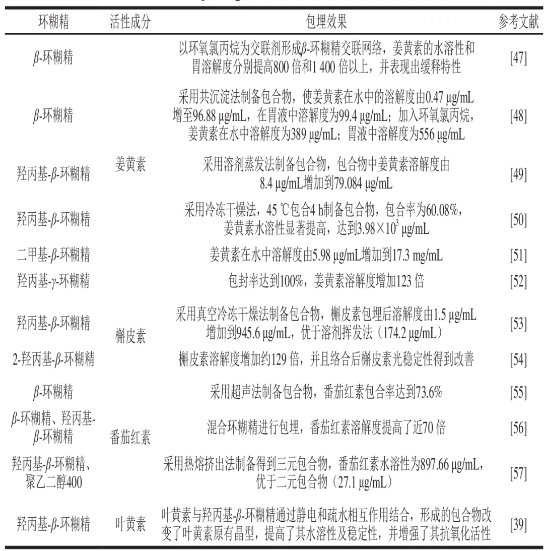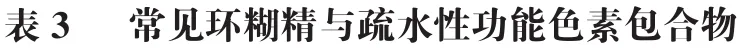 不同环糊精疏水性空腔大小存在差异,对客体物质的包合效果及形成包合物的稳定性存在显著区别。与β-环糊精相比,α-环糊精倾向于结合含有直链烷基的化合物而结合芳香族物质的能力弱,但分子两端含环状结构的类胡萝卜素不能完全进入β-环糊精空腔,仅形成复合物。因此,为增强环糊精的稳定性,改善水溶性、包合能力以及提高生物相容性等,研究者对其进行了多种化学修饰,包括甲基化、羟丙基化、酰基化、硫酸化及磷酸化。羟基被取代后环糊精由结晶固体转变为无定形态,从而改善其溶解度等性质。其中,羟丙基β-环糊精以其良好水溶性(>600 mg/mL)、生物相容性和低毒性被广泛应用于活性物递送及控释。不同类型环糊精及其衍生物对疏水性功能色素包埋效果见表3。总之,环糊精包合高度依赖分子大小及其结构与环糊精空腔的匹配度,由于被增溶物质性质差异,对应最适环糊精及其包合技术的选择需要具体而论。此外,已有研究发现β-环糊精包合会降低花青素的呈色效果,因此其对疏水性色素的呈色影响也需要考虑。