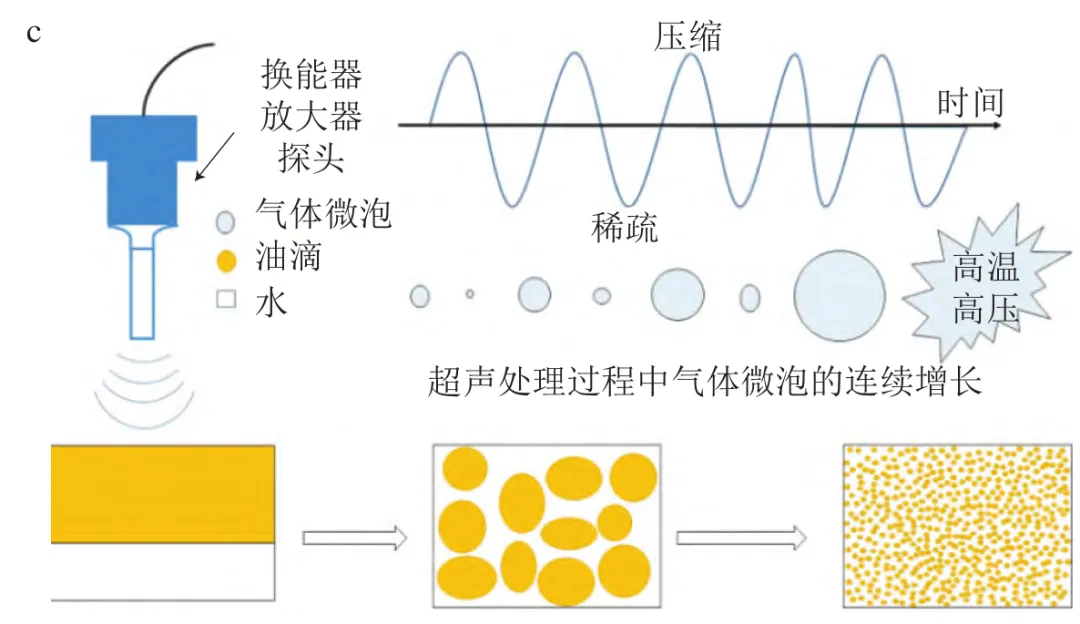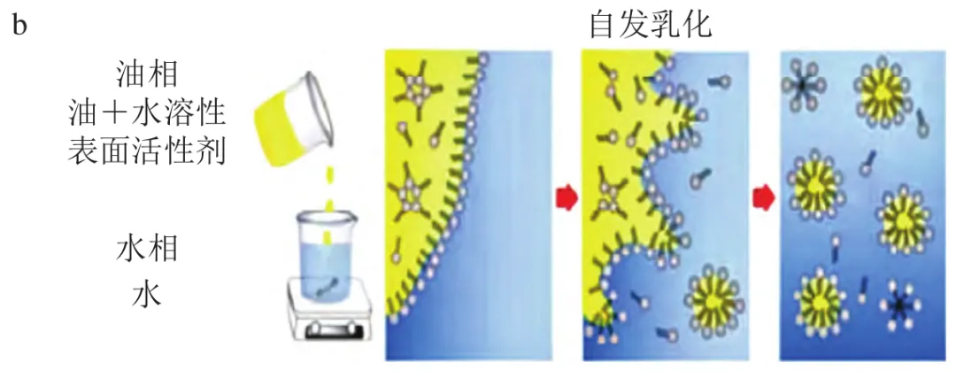 微乳液是一种由水相、油相、乳化剂和助乳化剂在环境诱导或自发条件下形成的透明或半透明的热力学稳定的乳液体系,平均粒径为10~100 nm。疏水性功能色素可包埋于水包油型微乳液的疏水内核中,以增加其在水中的分散度。微乳液制备方法主要有低能乳化法和高能乳化法。低能乳化法无需外部能量输入,各组分间(油相、乳化剂等)通过相互作用(如疏水相互作用、氢键等),在固定温度下调节各组分比例或种类,或固定组分及比例条件下仅改变体系温度以实现微乳液体系的稳定。高能乳化法则是通过高压均质机、超声波处理、高速剪切机等高耗能设备,在乳化剂作用下,使油相与水相均质混合得到粒径较小的微乳液。微乳液不仅可提高疏水性功能色素的溶解性,还可增强其在多种环境条件下(如光源、pH值变化、离心或长期贮存)的稳定性。此外,微乳液的纳米级粒径增加了色素与生物细胞的接触面积,促进其吸收,进而提升生物利用度。