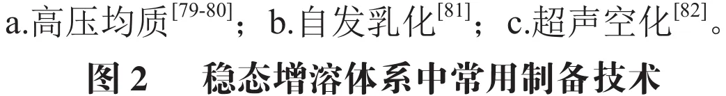 纳米乳液是由水、油和乳化剂组成,具有各向同性的动力学稳定体系。高剪切应力下形成的纳米乳液液滴尺寸小(粒径为10~1 000 nm)且分布均匀,在贮存时不易发生絮凝或分层。色素可先增溶于具有最佳溶解度的油相,再经高速剪切机、高压均质机等设备创造高剪切应力环境降低油水界面张力,使油水混合物先乳化形成粗乳液进而形成稳定的O/W型纳米乳液,以实现色素的增溶和稳态。Li Lijia等研究了经高压均质改性的大豆分离蛋白与染料木素协同稳定的纳米乳液,用于负载叶黄素。结果表明,二者通过疏水相互作用形成复合物,作为乳化剂可显著提高纳米乳液的稳定性,当共包封染料木素和叶黄素时,包封率高达93.88%,具表现出良好的贮存稳定性。Zhou Yingxuan等以山茶素A和溶菌酶作为乳化剂稳定的纳米乳液负载叶黄素,发现二者能协同降低水油界面张力,提高乳液在中、酸性及高温下的稳定性,能实现贮存3 d叶黄素保留率达到(74.33±3.21)%。Du Xiaoqian等比较了纳米乳液、粗乳液、乳液凝胶及高内相乳液体系递送槲皮素的稳定性,发现纳米乳液递送槲皮素不仅包封率高、乳液粒径最小,还具有最优热稳定性和贮存稳定性。但是,形成纳米乳液的油和表面活性剂的种类及添加浓度、制样温度、终乳液液滴粒径大小等均会对其动力学稳定产生影响,而纳米乳液对于色素溶解度和稳定性的增强也依赖于体系的高稳定性。稳态增溶体系中常用制备技术见图2。