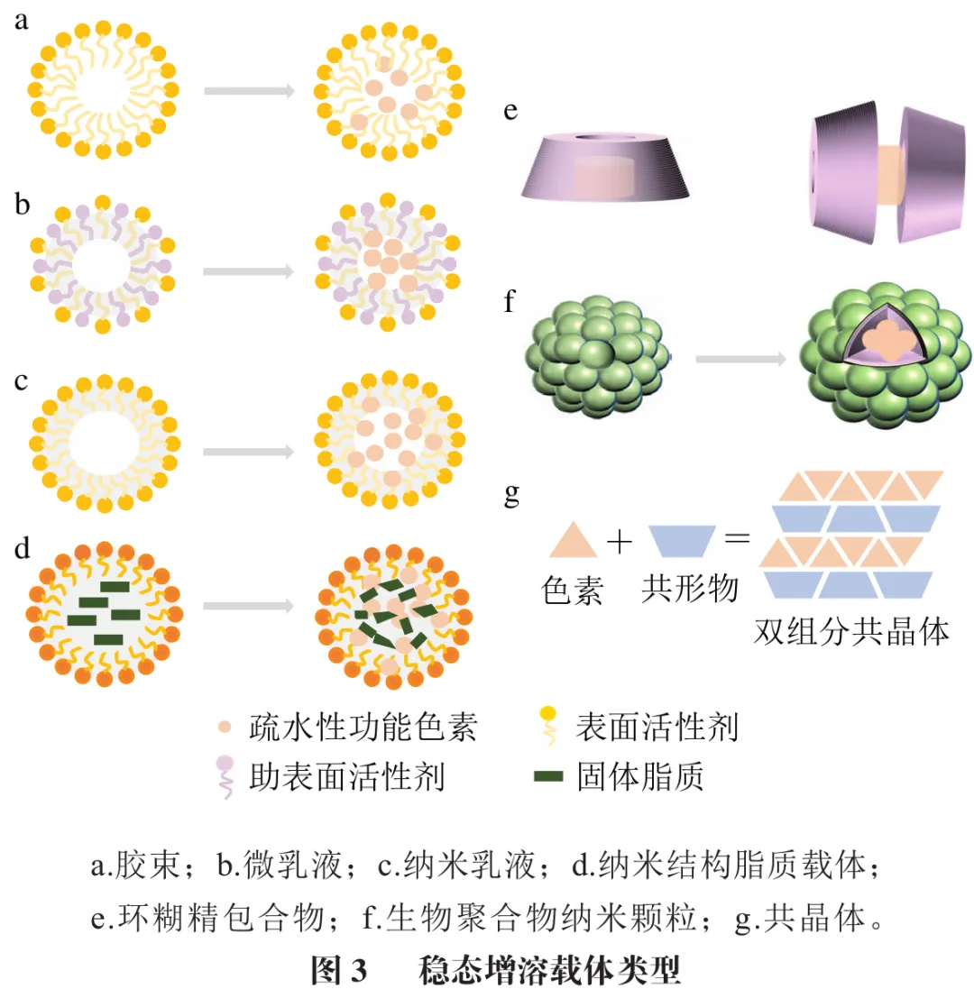 近年来多种技术应用于提高疏水性功能色素的水溶性和稳定性。乳化技术是重要手段之一,其改善疏水性色素在水中的溶解度主要与以下两种机制有关:一是基于油相增溶,即将色素优先溶解在油相(如玉米油、亚麻籽油或中链甘油三酯等)形成均匀分散的分子状态。二是基于表面活性剂增溶。表面活性剂具有两亲性,能够吸附在油-水界面形成单层或多层膜,其疏水尾部可为疏水性色素提供疏水微环境,同时也可以形成胶束增溶色素分子。此外,也可基于天然两亲性分子结构中疏水部位与色素分子相互作用或对色素分子进行改性修饰等技术而实现色素增溶。值得强调的是,通过这些技术构建的增溶体系同时也是实现色素稳定性增强的关键。一方面,增溶体系中的包埋壁材(如多糖、蛋白质及脂质)稳定性较为优异,自组装形成核壳结构,可作为色素免受光、热降解的屏障;另一方面,色素可与壁材组分通过氢键或范德华力等形成复合物,进一步锚定色素并抑制其降解或聚集,从而协同改善色素的稳定性。