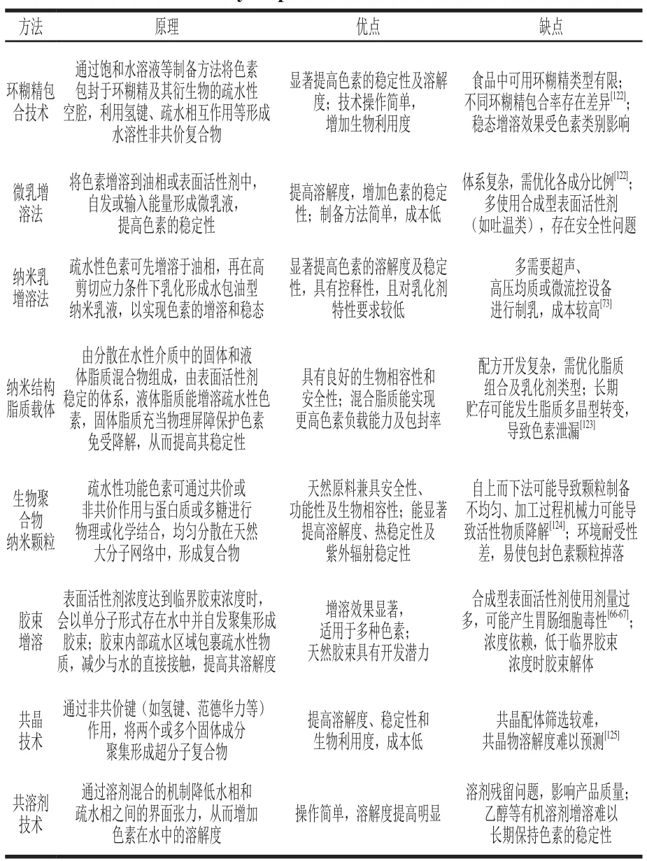 复合策略通过结合多种技术显著提高色素水溶性和稳定性。Yilmaz等以磺基琥珀酸二辛酯钠盐为表面活性剂,异辛烷和丙酮作为溶剂,二乙烯砜为交联剂,采用反胶束微乳交联技术合成α-、β-、γ-环糊精颗粒,通过负载姜黄素评价环糊精颗粒负载及释放效果。结果表明,合成环糊精具有可控的负载和释放曲线,α-环糊精具有最大载药量0.494 mmol/g,β-环糊精与姜黄素的复合物稳定性最佳,而具有最大空腔的γ-环糊精与姜黄素的复合物最不稳定。Liu Yiwen等将低共熔溶剂与微乳液相联合,开发油包低共熔溶剂的姜黄素微乳液。其结果表明,当肉豆蔻酸异丙酯占比35%、混合表面活性剂占比5%、低共熔溶剂占比5%时,体系可形成透明澄清的微乳液,基于此配方下的微乳液能使姜黄素的溶解度达到31.025 mg/mL。Li Yinghui等将海藻酸钠-多孔淀粉溶液作为凝胶基质(GM),添加姜黄素微乳液,形成微乳凝胶以提高负载姜黄素微乳的稳定性及控释性。结果表明,姜黄素微乳液与GM比例为1∶3时,负载姜黄素量达到14.9 mg/g,包埋率达到89%,且具备最佳生物活性。Liu Meiqi等采用pH值驱动法制备姜黄素负载酪蛋白纳米颗粒(CCNP),使用卵磷脂制备姜黄素脂质体(CLP),并将脂质体(LP)与酪蛋白纳米颗粒混合得到复合物(CCNP/LP),研究不同包埋体系对姜黄素封装后稳定性的影响。结果表明,CCNP/LP封装姜黄素具有优于CCNP、CLP的贮藏稳定性和热稳定性,80℃处理1 h后CCNP/LP中姜黄素保留率为(88.25±6.23)%,包封率为(74.66±4.23)%,明显优于CCNP中姜黄素保留率((74.20±1.68)%)和包封率(0%)。Xia Shasha等采用pH值驱动法制备了玉米蛋白和乳清蛋白纳米纤维复合纳米颗粒(ZWNP),并进一步将ZWNP用作高内相Pickering乳液(HIPPEs)稳定剂。结果表明,ZWNP稳定的HIPPEs具有良好的贮存、紫外辐射及热稳定性,可有效保护内包番茄红素,包封效率达到97.24%;包封后番茄红素抗氧化活性得到提高;不同乳液处理组中番茄红素生物利用度分别为(44.33±2.71)%、(37.85±1.86)%、(43.14±1.15)%,均显著高于玉米油中生物利用度((23.83±2.13)%),表明通过玉米醇溶蛋白稳定的HIPPEs封装番茄红素可提高其生物可及性。这些复合策略的应用,可以通过协同作用显著提高疏水性功能色素的水溶性,达到更优的增溶效果和生物利用度。