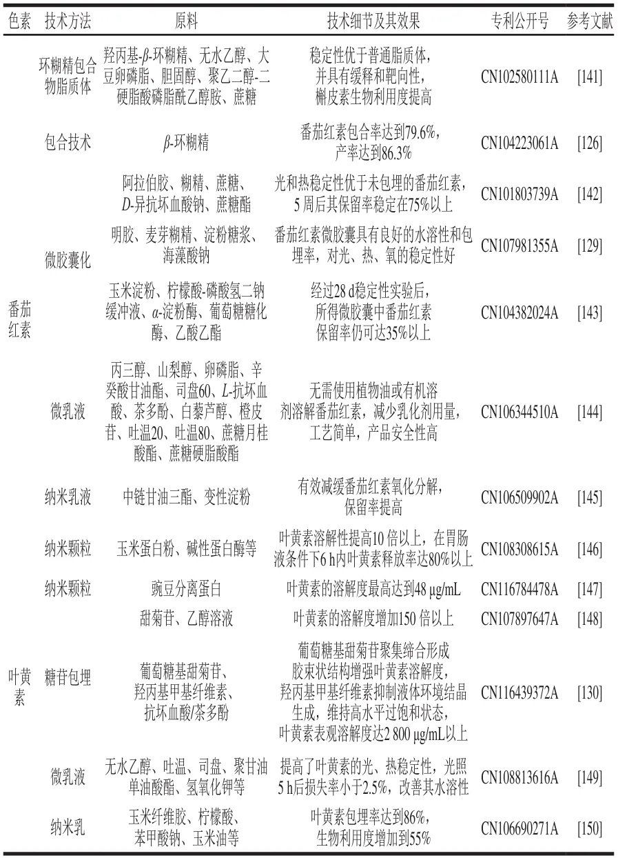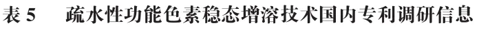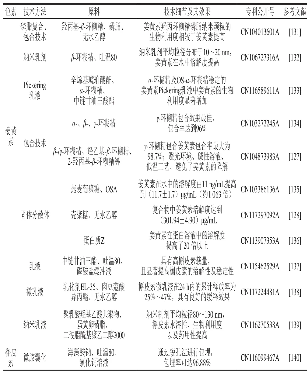 基于疏水性色素稳态增溶技术研究现状,本研究系统调研了国内相关专利技术(表5)。专利分析表明,环糊精包合技术已实现产业化成熟应用,其中β-环糊精对番茄红素的包埋率达79.65%(CN104223061A),γ-环糊精对姜黄素包埋率高达98.7%(CN104873983A),而复合环糊精体系(如α/β/γ-环糊精协同)可进一步提升包封效率。需注意的是,食品领域环糊精使用受法规严格限制(仅允许α-、β-、γ-环糊精),且β-环糊精添加量需符合GB 2760—2024《食品添加剂使用标准》(≤0.5 g/kg);相较而言,药品领域可拓展使用羟丙基-β-环糊精等修饰衍生物。此外,专利技术呈现多元化发展趋势:1)固体分散体技术通过将色素以无定形、分子或微晶等形式均匀分散于水溶性载体,形成无定形态复合物(如姜黄素-壳聚糖复合物中姜黄素溶解度达到(301.94±4.90)μg/mL,CN117297092A);2)微囊化技术采用喷雾干燥工艺构建壁材屏障(明胶-麦芽糊精体系),实现番茄红素水溶性及光、热等稳定性改善(CN107981355A);3)糖苷包埋技术利用甜菊苷胶束结构负载叶黄素,表观溶解度突破2 800 μg/mL(CN116439372A),显著优于传统乳化体系。