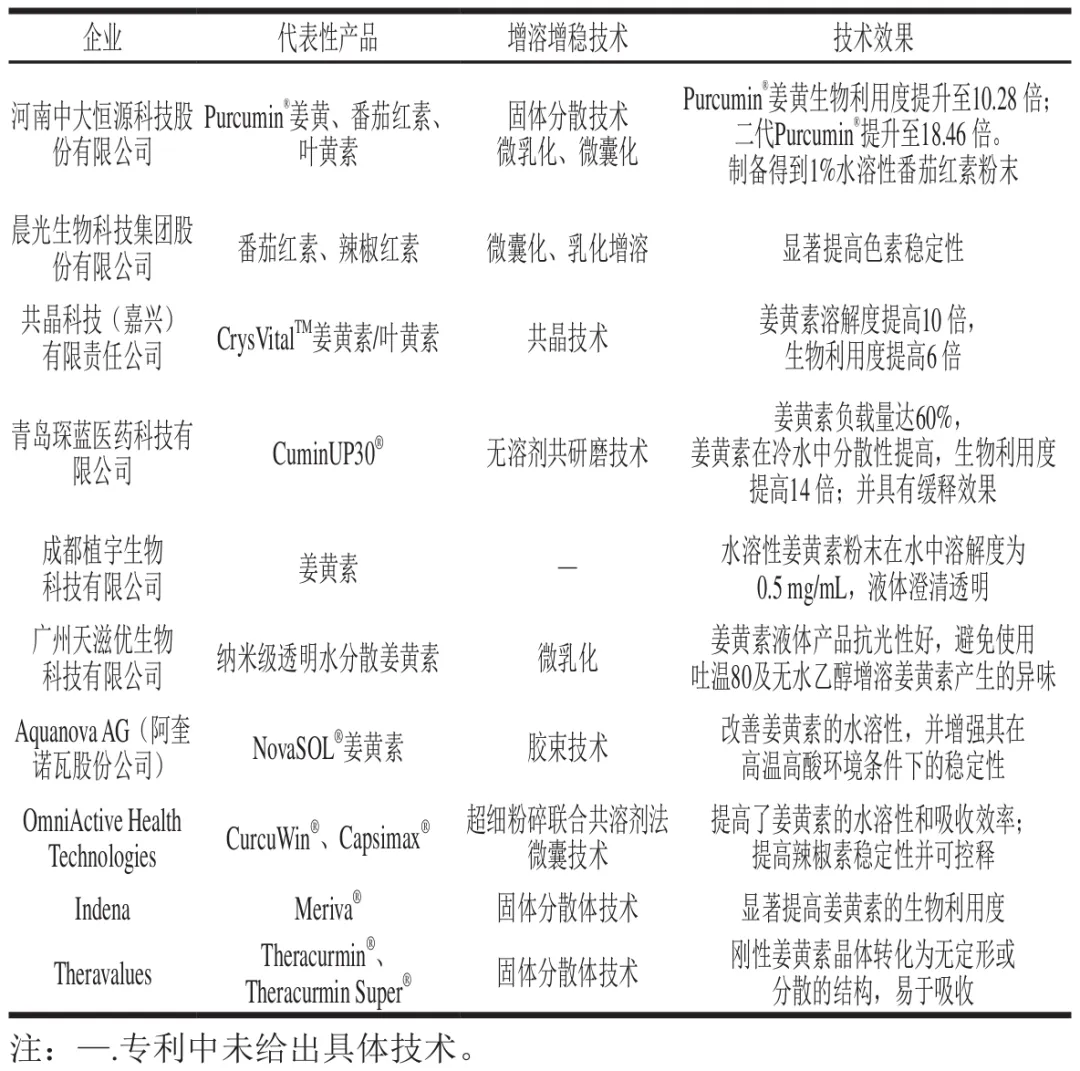 针对现有稳态增溶技术应用的特点及局限性,进一步通过市场产品补充分析,发现产品中用于提高疏水性功能色素溶解度和生物利用度的技术主要集中在固体分散体、微乳增溶、微囊化、乳液增溶、胶束增溶、共晶技术、共研磨以及共溶剂技术(表6)。产品类型主要分为3 类:一类为疏水性色素粉末,适用于后续产品加工,如河南中大恒源生物科技股份有限公司采用微囊化技术制备得到1%水溶性番茄红素粉末;二类则为以疏水性色素为主要功能活性成分的饮料或胶囊,如成都植宇生物科技有限公司开发的姜小黄系列饮品;三类则是疏水性色素液体,如广州天滋优生物科技有限公司开发的透明度良好的水溶性姜黄素、河南中大恒源科技股份有限公司开发的水溶性辣椒红乳液等。