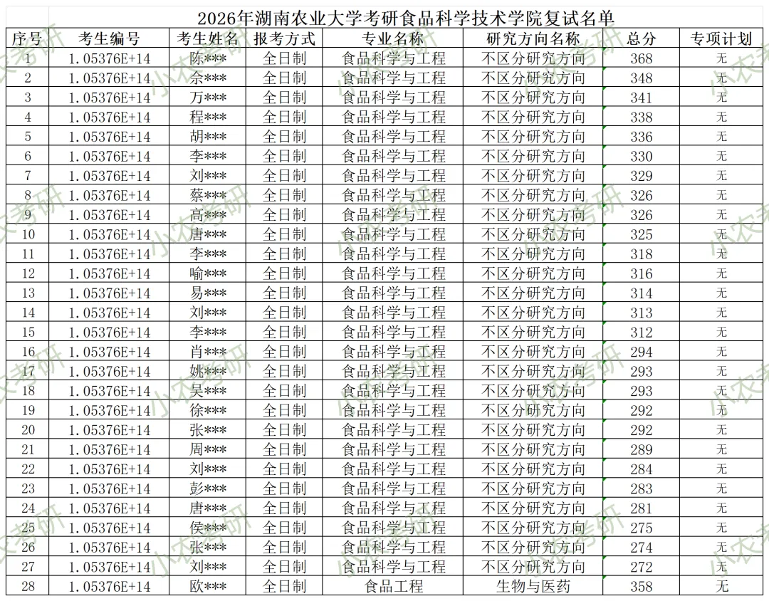 2026年硕士研究生招生考试复试名单公示(附件1),请登录湖南农业大学食品科学技术学院网站(https://spkj.hunau.edu.cn/)通知公告栏查看。