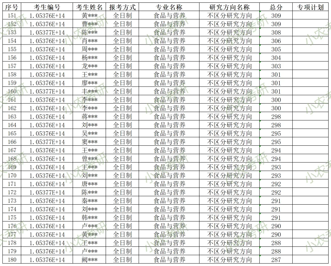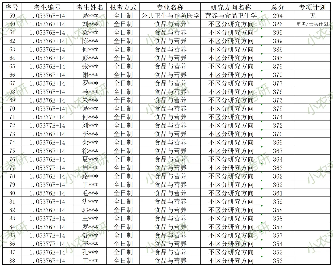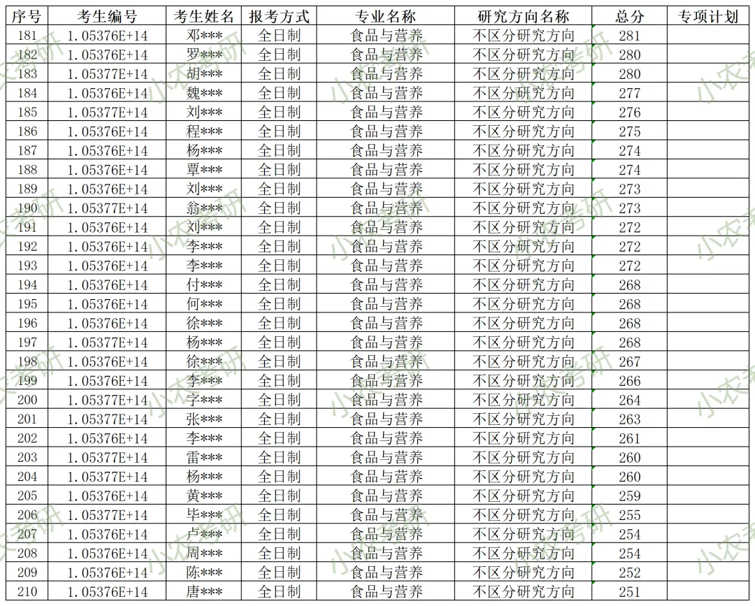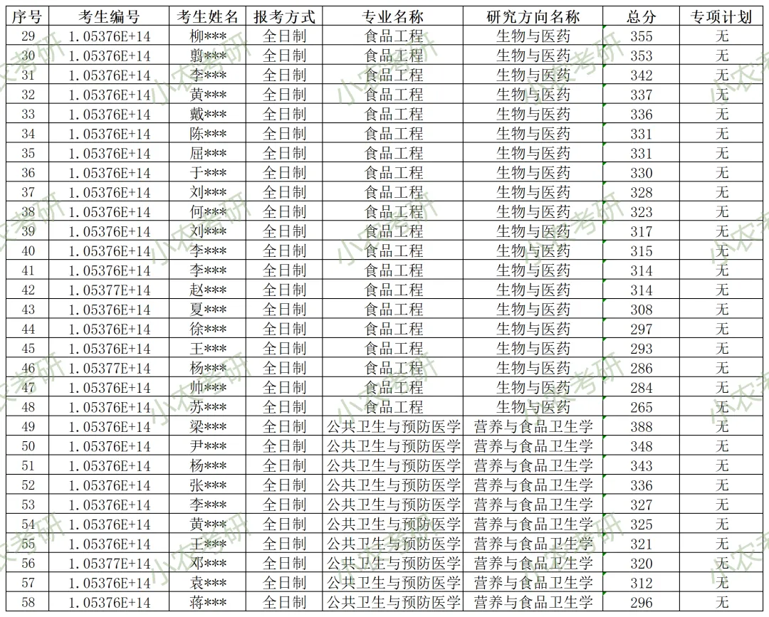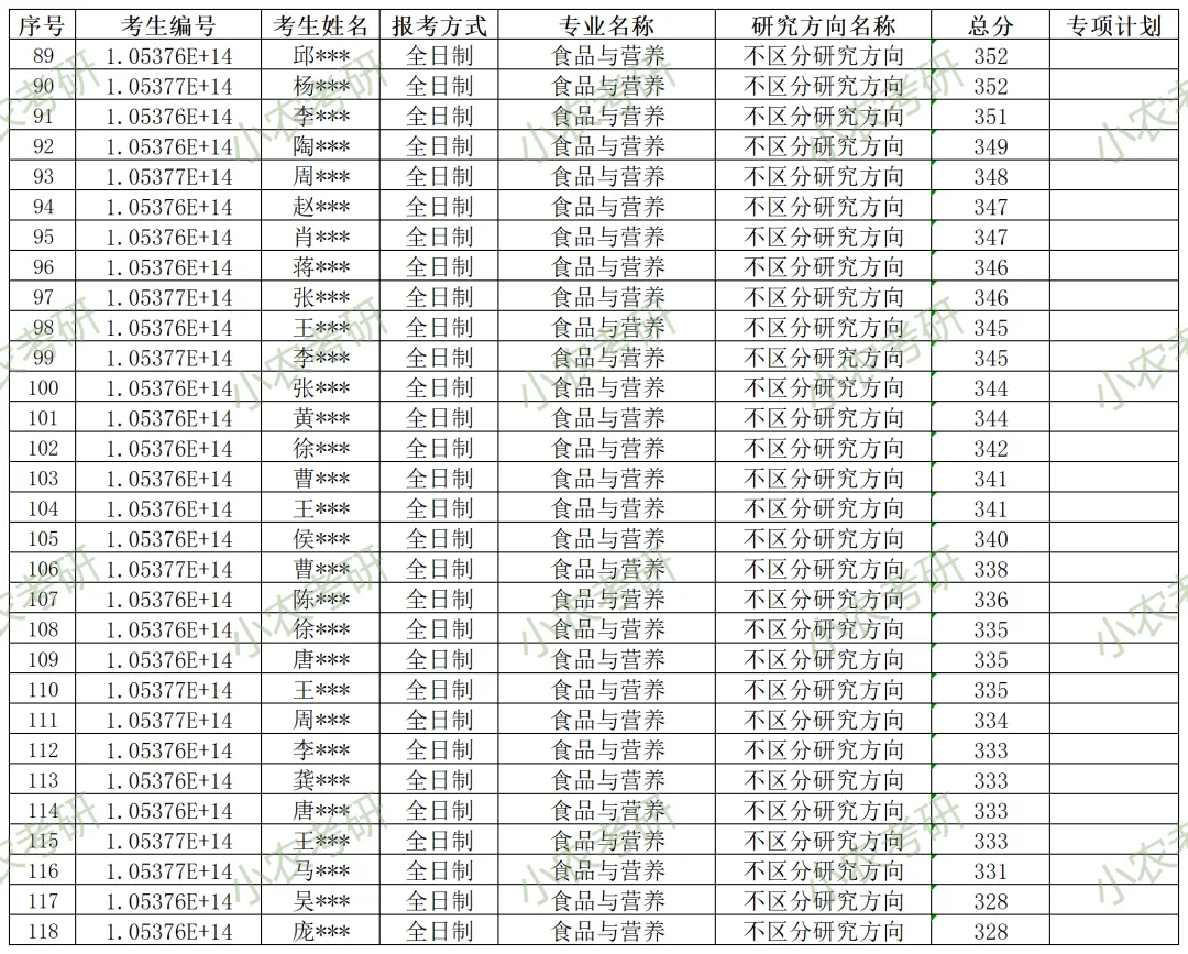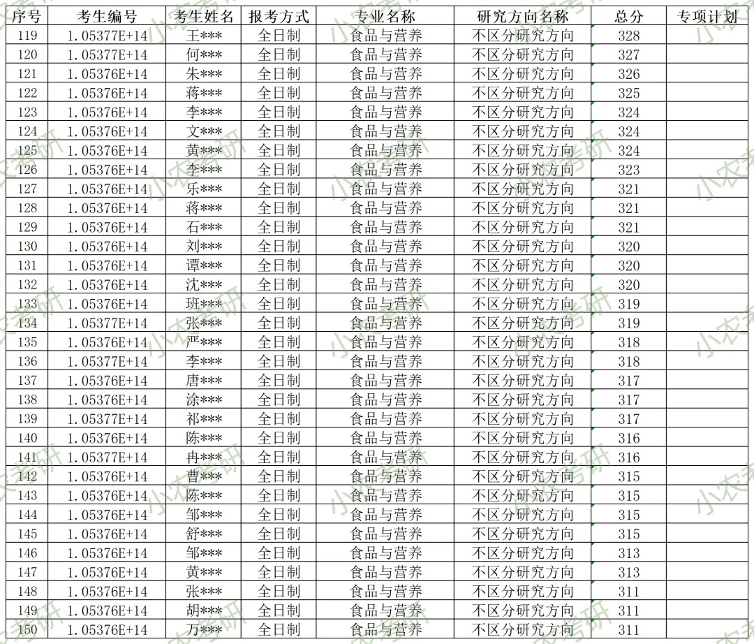 095500 | 食品与营养(全日制) | 不区分研究方向 | 99(含“退役大学生士兵”专项计划1个,农科院联培3个) | |