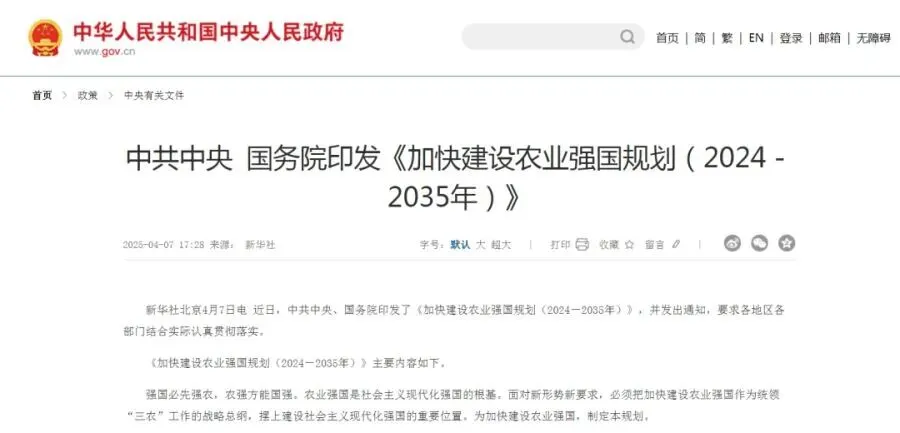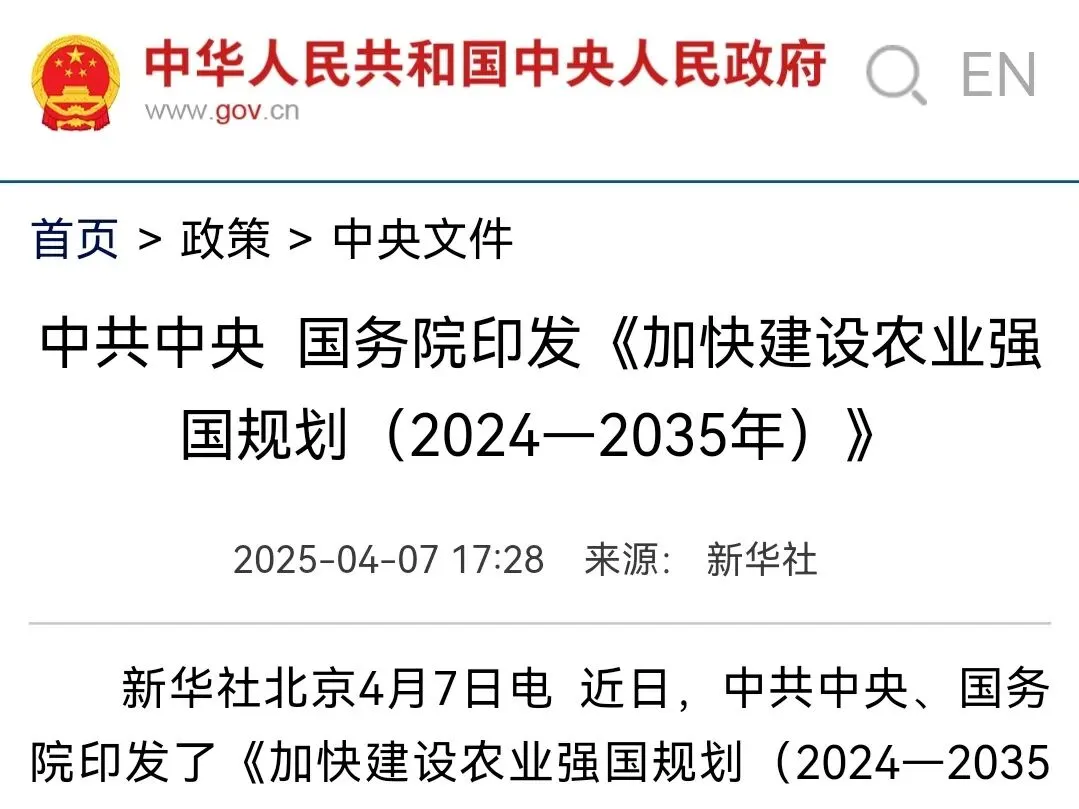 中共中央 国务院印发《加快建设农业强国规划(2024-2035年)》