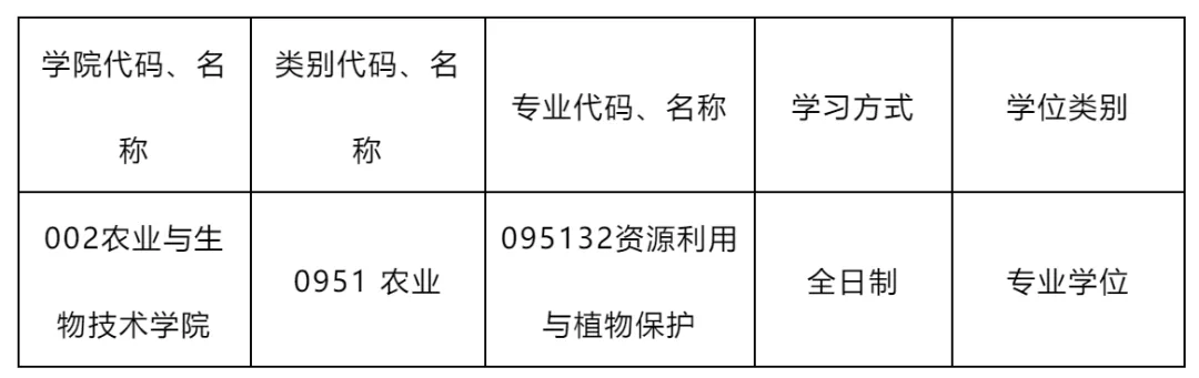 2026年农业硕士(0951)专业学位授予点,资源利用与植物保护(095132)专业相同相近认定范围为:0951 农业0954 林业0955 食品与营养0901 作物学0902 园艺学0903 农业资源与环境0904 植物保护0907 林学0908 水产0909 草学0972 食品科学与工程。