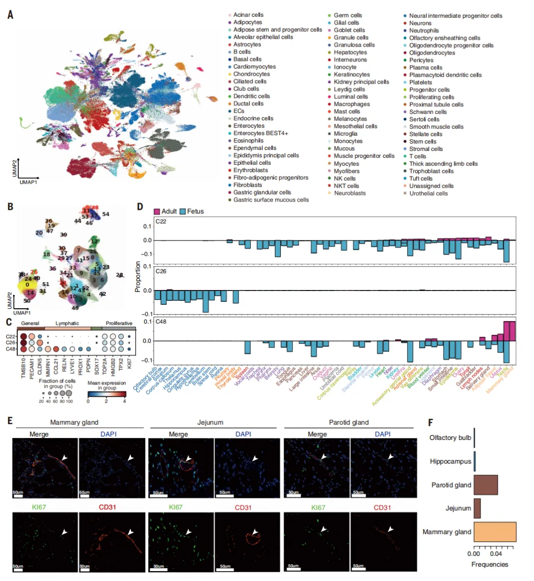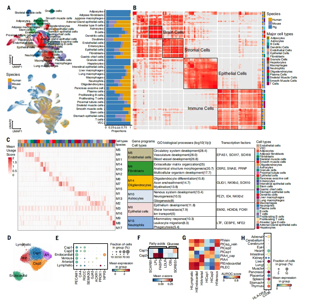 全景细胞图谱:解析妊娠这一复杂生理过程的核心难点,在于无法从健康人体中获取覆盖全周期、全器官的组织样本。为此,研究团队另辟蹊径,选择与人类生理特征高度相似的猪作为替代模型,成功完成了这项“不可能完成的任务”。研究从同一头妊娠母猪及其胎儿体内,分别采集了119个与115个组织位点,在16小时内完成所有组织的解离与测序,成功构建了包含256万个细胞的单细胞图谱【图1】。这种“源自同一家系”的设计思路,有效排除了遗传背景、年龄阶段及环境因素的干扰,为跨器官细胞类型与分子特征的精准比较提供了前所未有的“纯净”分析平台【图2】。