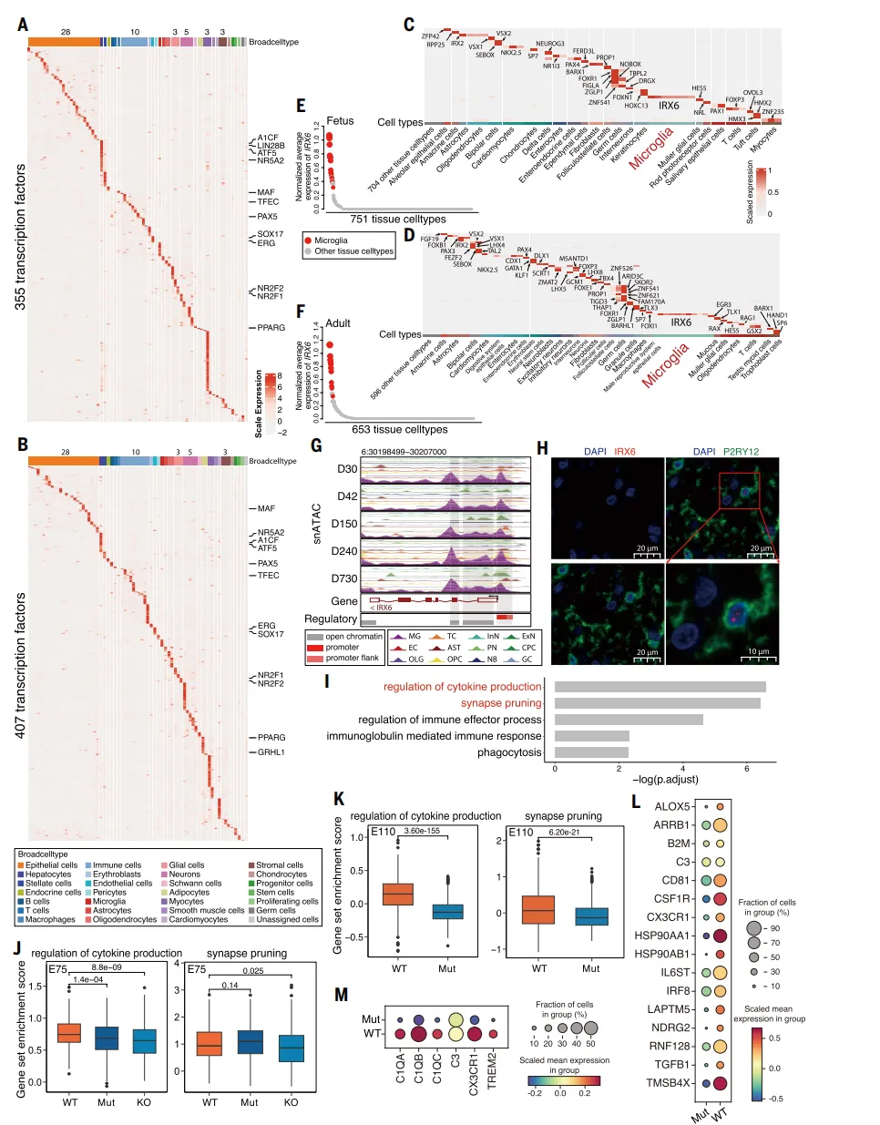 依托这张全景图谱,研究团队得以深入探索细胞层面的多样性。一个引人关注的发现,指向了大脑中的免疫细胞血管内皮细胞在不同器官中呈现出迥异的“功能特征”:脑部内皮细胞主动下调免疫相关分子,以维持大脑特有的免疫豁免状态;而外周器官的内皮细胞则高表达趋化因子,随时准备应对炎症信号【图3C】。更值得注意的是,转录因子IRX6仅在“小胶质细胞”这一脑内免疫细胞中呈现高表达,且其表达模式在胎儿期与成年期、多达11个脑区中均高度保守【图4E-H】。基因编辑功能实验证实,IRX6如同小胶质细胞的“核心调控因子”,直接参与调控其突触修剪与免疫因子分泌等关键功能【图4J-M】。