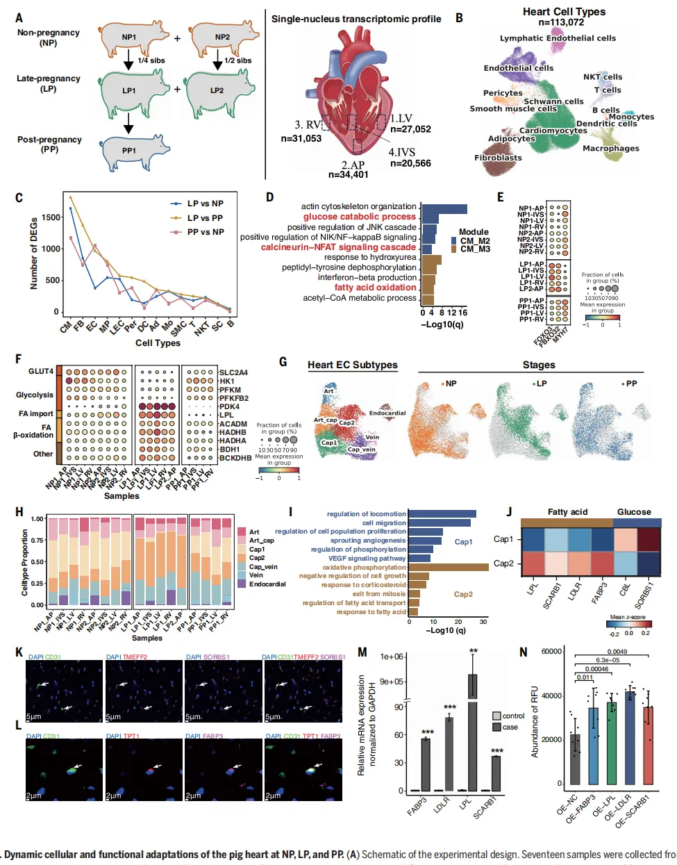 猪模型中的发现能否为人类健康提供参考?研究团队通过整合人类单细胞数据开展跨物种比较,结果令人振奋。数据分析显示,猪在妊娠期心脏中出现的Cap2细胞,与人类心脏中一种毛细血管亚型高度同源,两者均高表达脂肪酸转运相关基因【图7F, G】。同样,在胎儿生长受限中发挥关键作用的滋养层细胞与特定肌纤维亚型,在人类与猪之间也呈现高度的分子保守性【图7E】。这一发现为理解人类妊娠相关疾病提供了重要的参考依据。