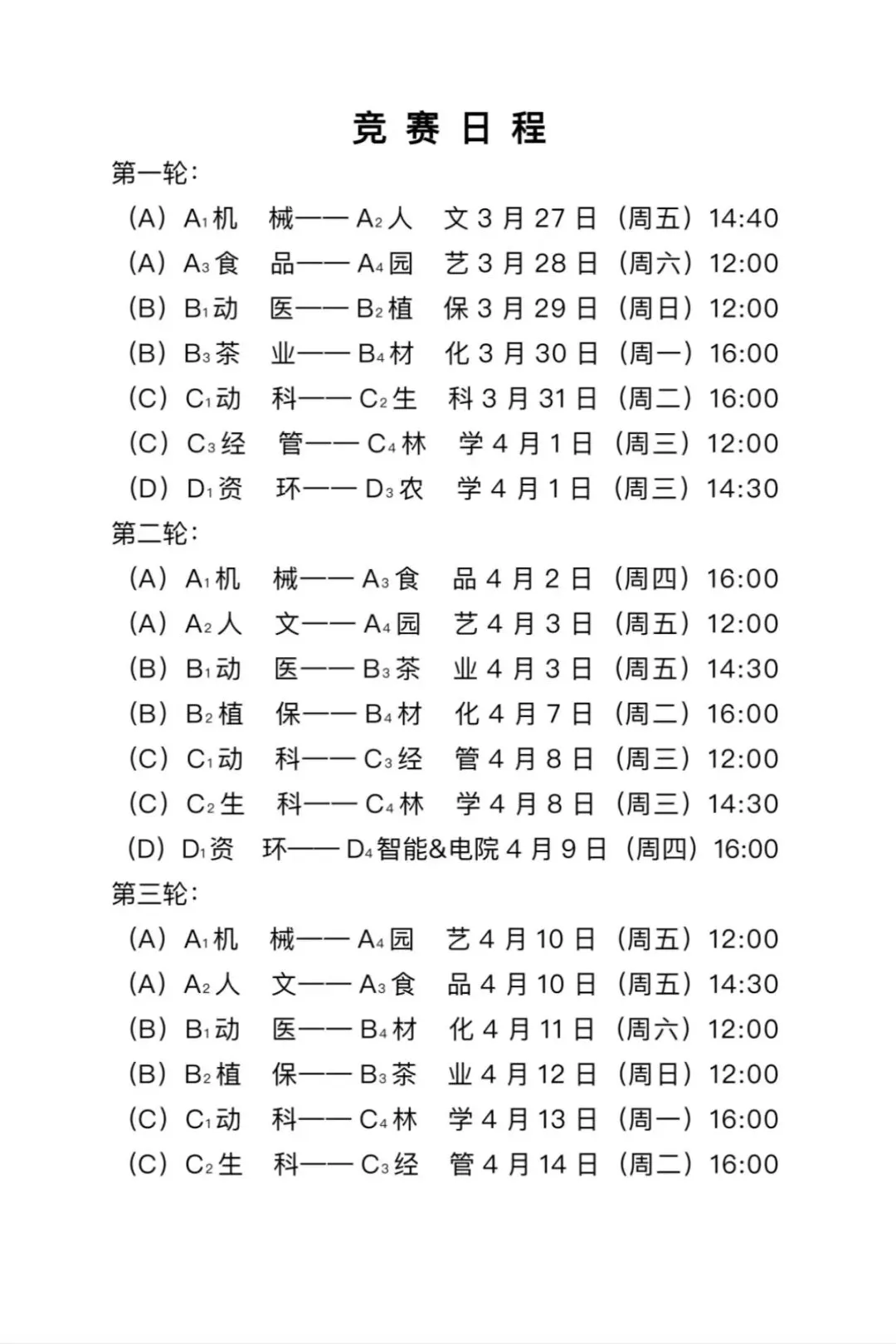本届“神农杯”足球赛共汇聚15支参赛队伍、309名参赛球员,赛事期间将展开29场精彩对决。作为我校校园文化的经典品牌活动,“神农杯”足球赛不仅是安农学子挥洒青春汗水、追逐绿茵梦想的舞台,更是学校深化体教融合、践行“五育并举”教育理念的重要载体,同时也是学校响应全民健身号召、丰富校园文化生活的重要举措。赛事的举办将进一步营造健康向上、全员参与的校园体育文化氛围,为校园文化建设注入蓬勃的青春活力。