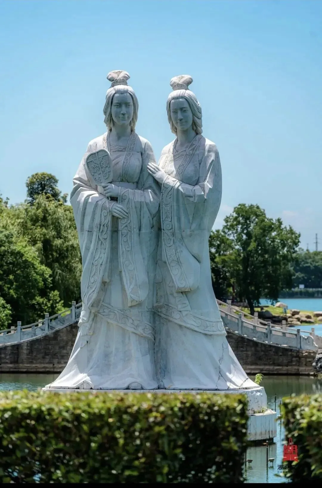 园内湖光潋滟,汉白玉二乔雕像亭亭玉立。