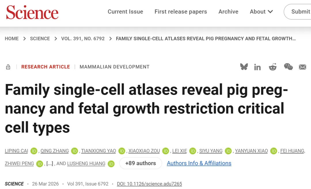 尽管已经有了大量的细胞图谱,但要获得一个单独的个体内所有组织的图谱仍然是一个挑战,尤其是胎儿和母体。2026年3月10日,江西农业大学黄路生团队在Science在线发表题为“Family single-cell atlases reveal pig pregnancy and fetal growth restriction critical cell types”的研究论文。该研究构建了全球首个“全家桶式”(All-from-one)猪单细胞时空图谱。该研究利用单细胞转录组测序(scRNA-seq)与单细胞核转录组测序(snRNA-seq)技术,对一头怀孕母猪(F1M1)及其雄性胎儿(F1S1)的405个样本进行了深度分析。图谱涵盖了胎儿115个组织位点和母体119个组织位点,总计包含256万个细胞。这一规模宏大的数据不仅绘制了生命全景,更在细胞分辨率下精确解析了妊娠期的复杂生理重塑。了解细胞如何在单个身体的所有组织中发挥作用,对于揭示器官如何在不同的生理条件下协调和适应至关重要。尽管存在大型单细胞图谱,但从一个个体的所有组织中获得完整的图谱仍然是一个重大挑战。