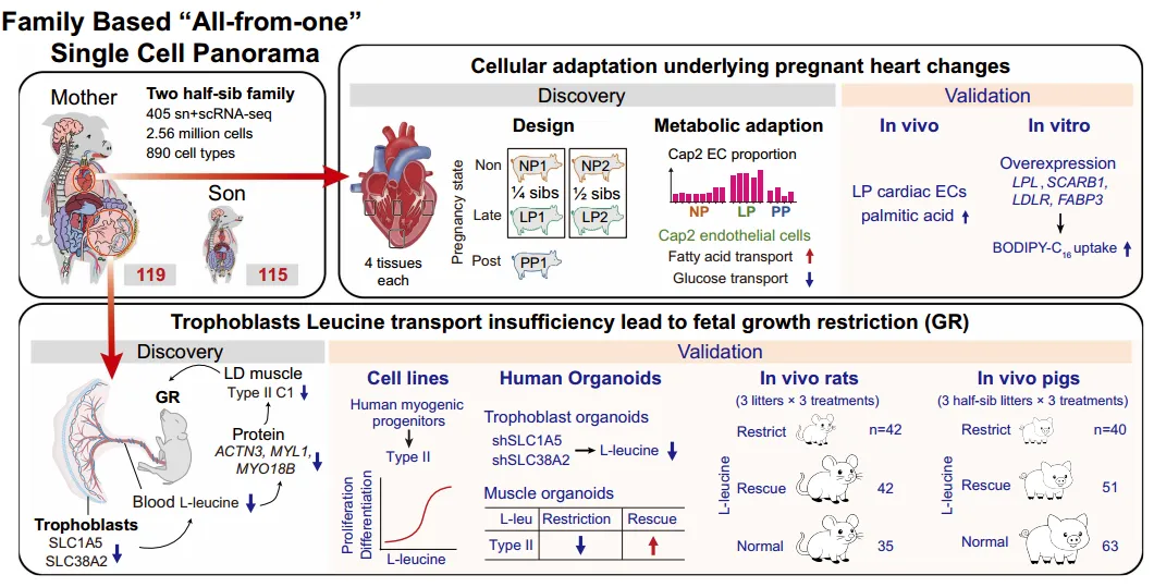 该研究展示了一个256万个单细胞的转录图谱,分别覆盖了一只胎猪和它的怀孕母猪的115和119个组织。研究发现,一群具有增强脂肪酸转运能力的心脏毛细血管内皮细胞在怀孕时富集,但在怀孕后恢复。还发现滋养层l-亮氨酸转运不足通过减少肌II型肌纤维亚簇导致胎儿生长受限。该研究的“all-from-one”策略能够识别组织细胞类型特异性转录因子,并为妊娠心脏适应和胎儿生长受限提供了见解。