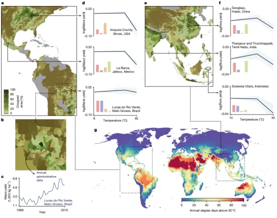 该研究采用了一种融合计量经济学与大数据驱动分析的“简约形式(reduced-form)”框架,以弥补传统过程模型与经验研究之间的鸿沟。具体而言,作者首先构建了一个全球尺度的高分辨率面板数据集,涵盖54个国家、12,658个次国家行政单元、六大主粮作物(约占全球热量供给的2/3),并结合逐日气象数据(温度、降水等)与社会经济数据(收入、灌溉条件等) 。在模型构建上,研究通过固定效应和趋势项剔除不可观测因素(如土壤、制度差异),并利用交叉验证从大量候选气候变量中筛选关键驱动因子,从而刻画“天气—产量”的非线性关系。更关键的是,该研究通过将短期天气冲击与长期气候均值相互作用,引入“气候适应”的识别策略:即假设处于相似气候与经济条件下的农户会采取相似的管理决策,从而在不直接观测具体措施(如换种、调播期、施肥调整)的情况下,间接估计适应行为的总体效果及其成本与收益。这种方法能够在全球尺度上同时捕捉生物物理响应与人类适应行为的综合影响,并进一步结合多情景气候模型(RCP4.5与RCP8.5)与蒙特卡洛模拟,对21世纪不同阶段的农业产量变化进行概率预测,实现从历史观测到未来情景的外推分析 。