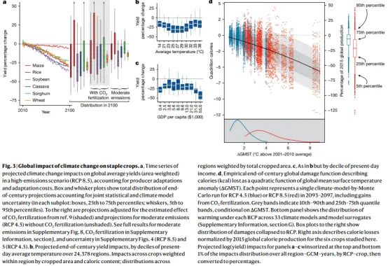 研究表明,在考虑适应行为后,气候变暖仍将对全球农业生产产生显著负面影响,但不同作物、区域与经济水平之间存在明显异质性。总体上,全球平均气温每升高1°C,将导致约5.5×10¹⁴ kcal的年粮食产量损失(约相当于人均每日减少120 kcal,约占推荐摄入量的4.4%),且这种损失随升温近似线性增加 。在作物层面,除水稻外,大多数主粮作物(如玉米、大豆、小麦)在高排放情景下均呈现显著减产趋势,例如到本世纪末玉米和小麦减产幅度可达约−28%至−30%,大豆甚至超过−35%;而水稻受益于部分适应与气候条件,其总体影响相对较小甚至存在不确定性。在空间格局上,研究发现损失并非主要集中在最贫困或最炎热地区,而是显著集中在当前气候适宜、农业高度集约化的“全球粮仓”地区(如美国中西部、中国东部等),这些地区虽然生产力高,但现有适应程度较低,因此对气候变化更为敏感;相反,部分低收入和高温地区由于已经形成较强的适应能力,边际损失相对较小 。此外,适应行为和经济发展能够在一定程度上缓解损失(到2050年和2100年分别减少约23%和34%的潜在损失),但无法完全抵消气候变化带来的负面影响。整体而言,该研究揭示了一个关键结论:即使在现实适应行为持续发生的情况下,全球农业系统仍将面临系统性减产压力,且这种压力在空间上呈现出由“高产核心区主导”的特征,对全球粮食安全构成深远挑战。