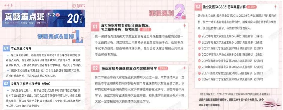 简单来说,真题重点班是入门级课程,也是备考复习中最最基础的资料了!赠送资料:340和831的知识点合集、340和831的历年真题、340和831的思维导图,需要结合参考书一起使用,里面有考试的重难点和每本书里面的知识点清单。真题集里配有答案。真题重点班针对340和831两门专业课中的重难点和易考点进行讲解,让考生明白海南大学渔业发展如何考、考什么、怎么考、怎么复习有具体的了解和规划。同时还根据近年海南大学考研初试真题进行详解,结合真题进行分析,更加贴合考试要求,有针对性地输入。另外还有丰富的电子资料可领取。