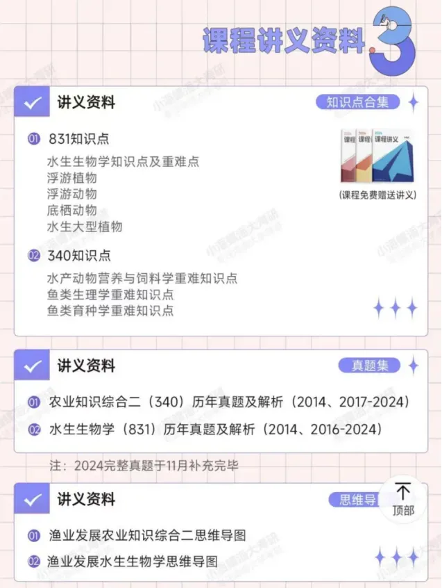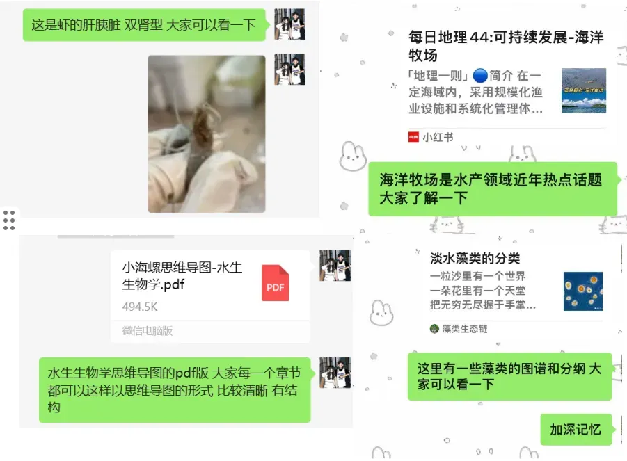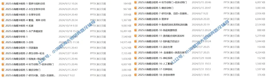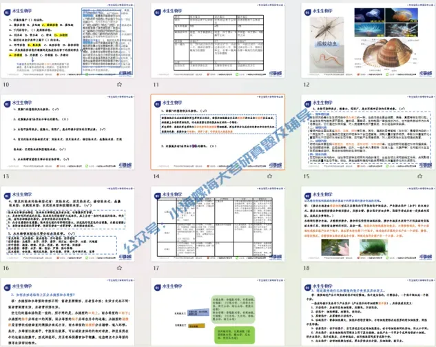 以PPT课件展示的形式,细致全面地讲解《水生生物学》、《鱼类生理学》、《水产动物营养与饲料学》等书中的知识考点,带领同学们快速高效地了解专业课考试中的重难点,并帮助考生掌握每门专业课备考的技巧与方法。在这一阶段,其主要任务有两个:一是希望考生通过本阶段的学习,可以清楚的知道每个章节的知识考点;其二是希望考生可以在学习完本阶段课程后,脑海中可以架构出完整的知识框架,通过知识框架可以清晰地梳理出每门课程的考点脉络。并且会及时在群里分享学院信息、专业课的时政热点问题。