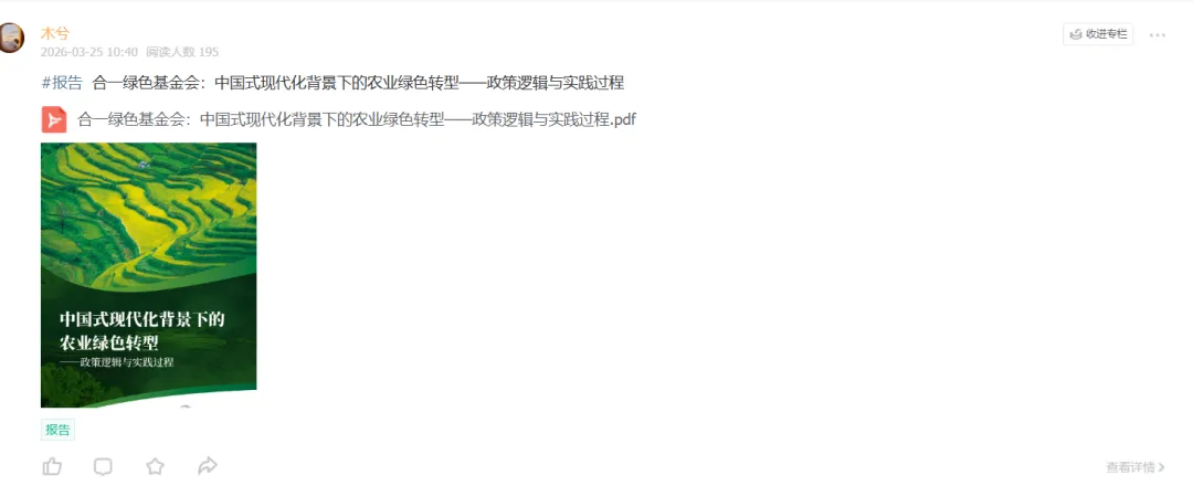 《中国式现代化背景下的农业绿色转型——政策逻辑与实践过程》报告,由北京合一绿色公益基金会发布,并获得人与自然同行基金会支持。报告系统梳理了中国农业从传统模式向绿色现代化转型的时代背景、政策演进与实践历程,深入剖析了转型过程中的机遇、挑战以及社会组织的独特作用,旨在为农业绿色转型的高质量推进提供参考。