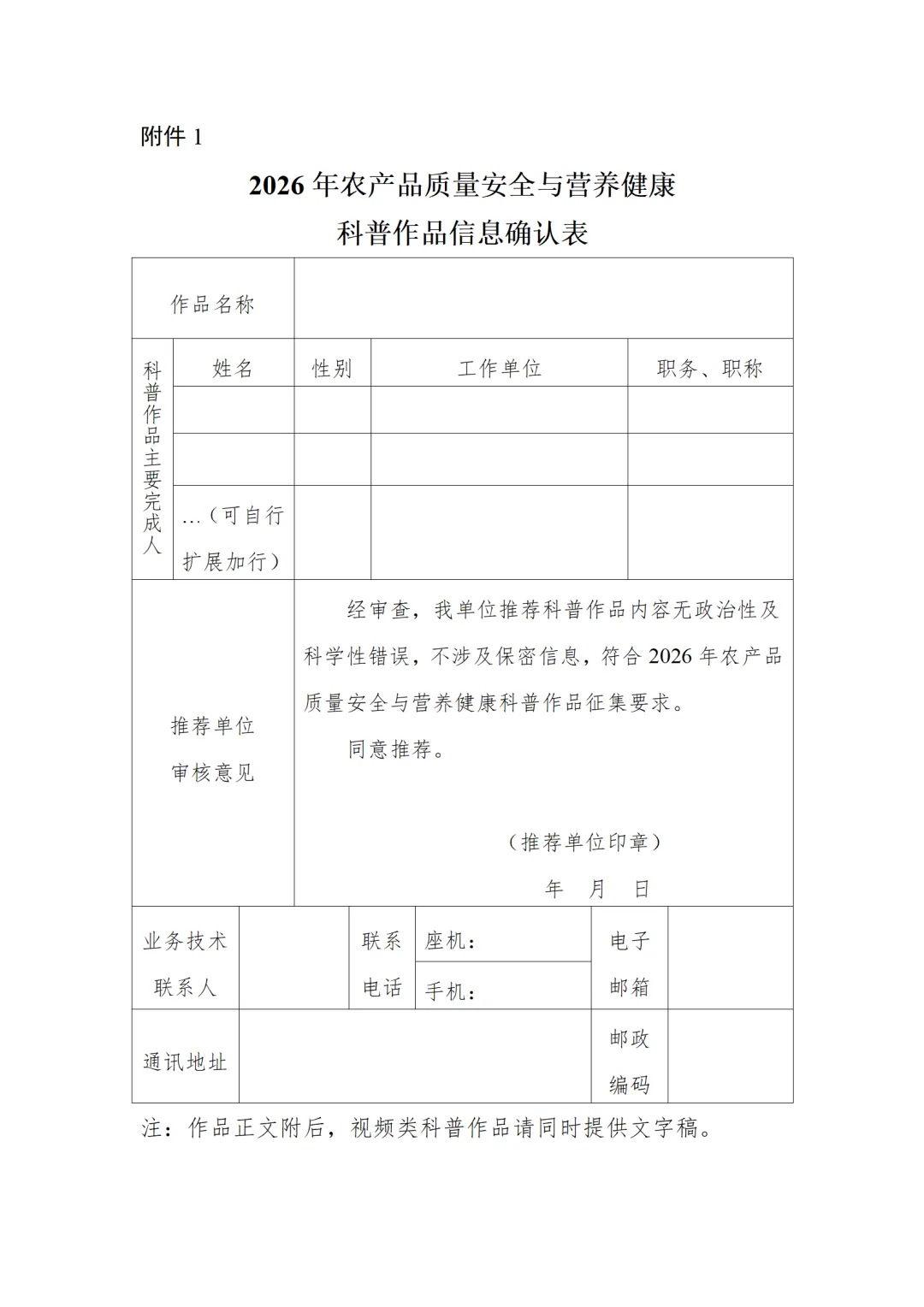 请各农产品质量安全与优质化工作机构、各农产品质量安全营养健康优质化业务技术依托单位及相关业务技术单位积极组织开展科普作品创作和科普需求研提。各单位推荐科普作品时,请填写科普作品信息确认表(见附件1)
