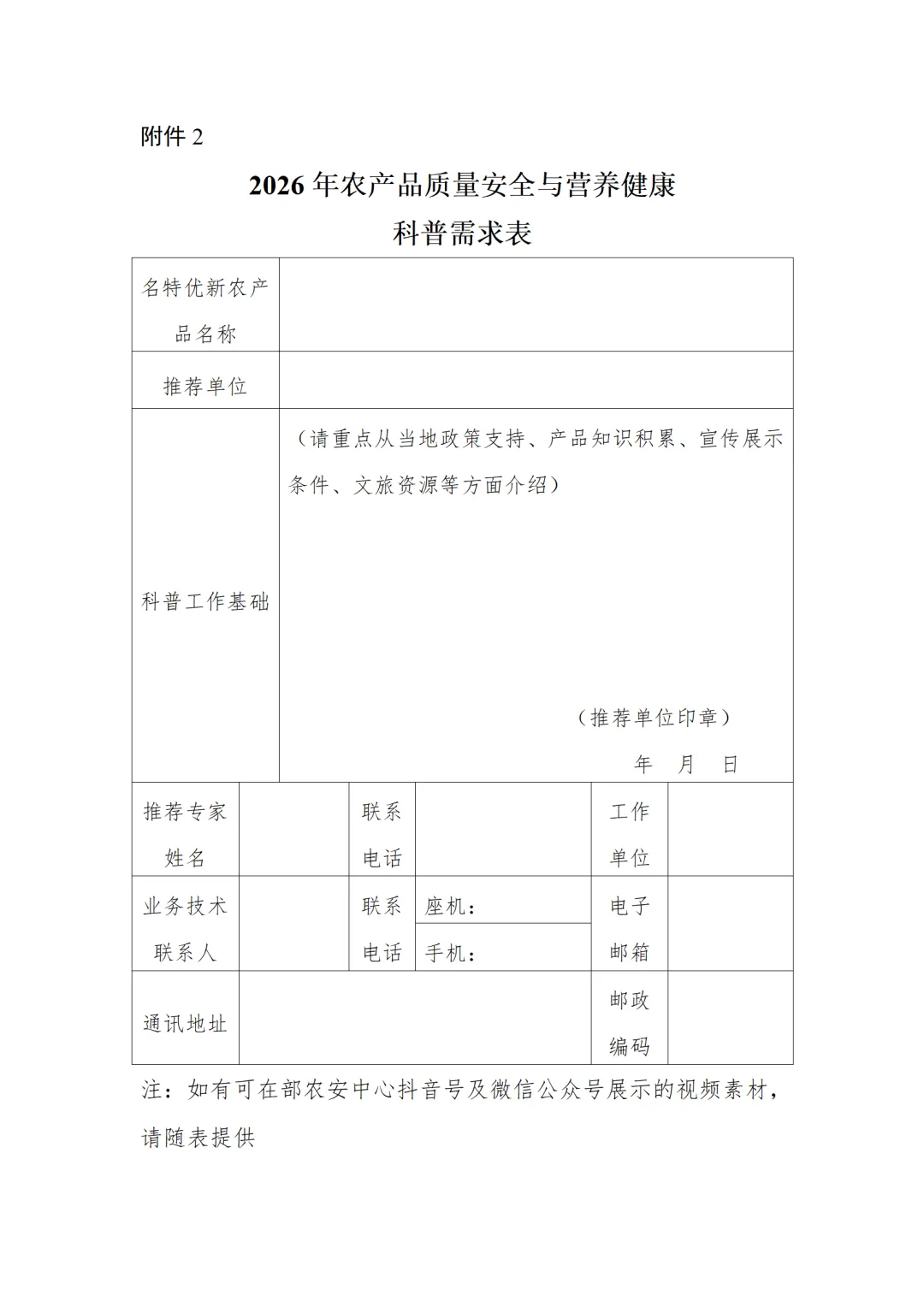 如有可在部农安中心抖音号及微信公众号展示的视频素材,请随表提供。