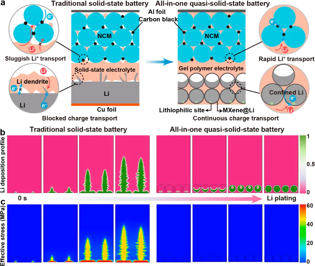 图1:一体化准固态电池的示意图和相场模拟。(a) 传统固态电池与一体化准固态电池的界面接触、离子/电子传输和锂沉积行为的示意图。相场模拟的锂沉积形貌(b)和有效应力(c)在使用超薄锂阳极的传统固态电池和使用MXene@Li阳极的一体化准固态电池中的演化。