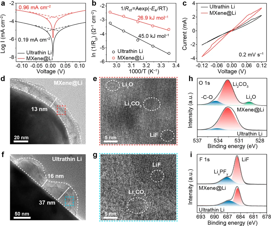 图3:Li+传输动力学分析。(a) 扫描速率为1 mV s-1、电位范围为-0.12至0.12 V时,超薄Li||超薄Li和MXene@Li||MXene@Li对称电池的塔菲尔曲线。(b) 超薄Li||超薄Li和MXene@Li||MXene@Li对称电池的Li+跨界面传输活化能(Ea)测试。(c) 扫描速率为0.2 mV s-1时,超薄Li和MXene@Li对称电池的循环伏安(CV)曲线。从0.1 C循环10次后的全电池中获得的(d, e) MXene@Li和(f, g) 超薄Li阳极的高分辨透射电子显微镜(HRTEM)图像。循环后的MXene@Li和超薄Li阳极的(h) O 1s和(i) F 1s X射线光电子能谱(XPS)谱图。