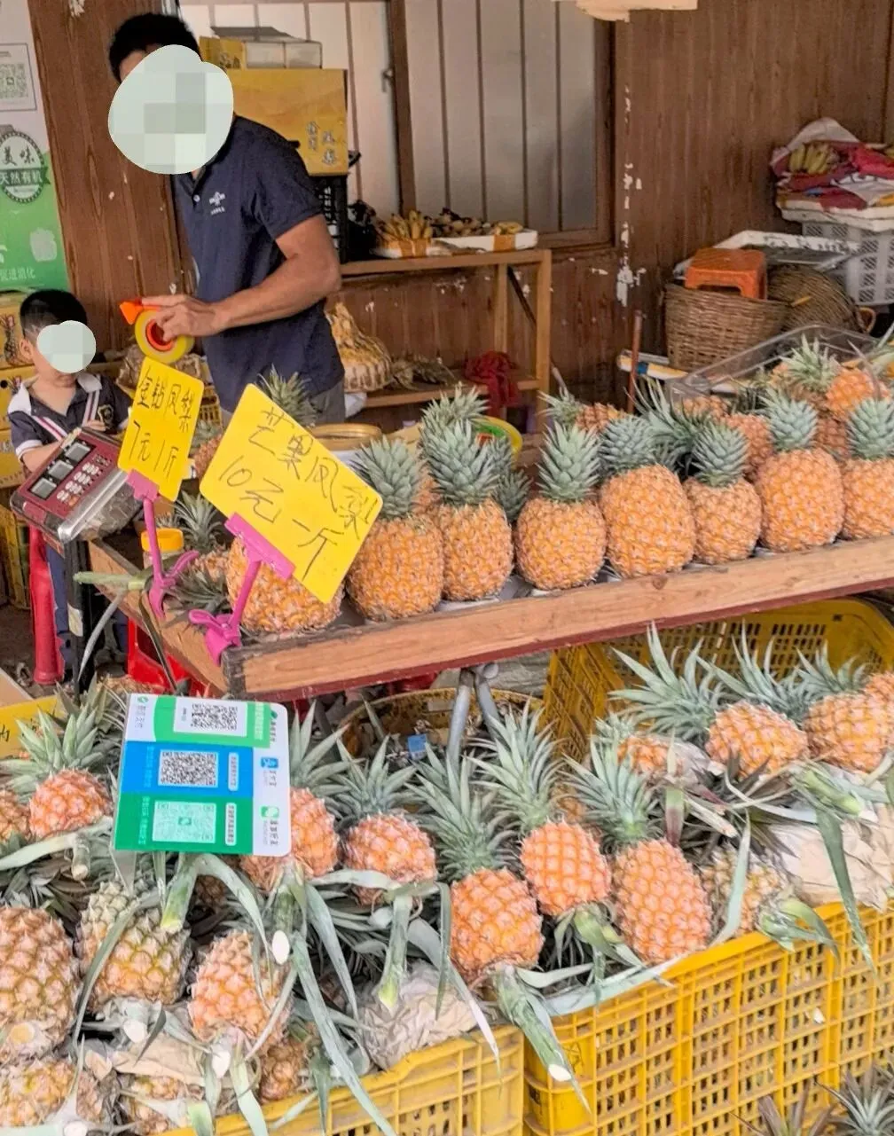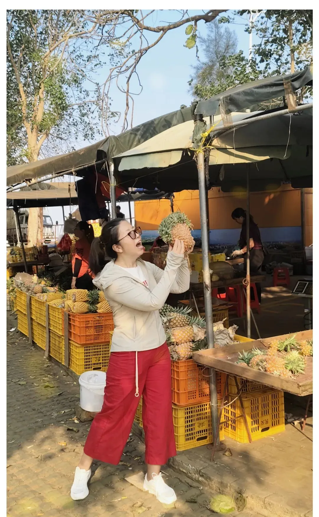 小路两边全是菠萝摊,摊主们特热情,一个劲地塞过来让试吃:芒果味的、小菠萝甜味的、金钻菠萝……我馋得不行,马上削了个芒果味的,开吃!