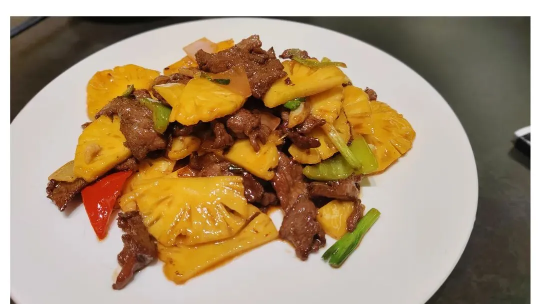 菠萝炒牛肉也绝了,牛肉滑嫩,菠萝解腻,酸甜咸香在嘴里一起炸开,越吃越开胃。