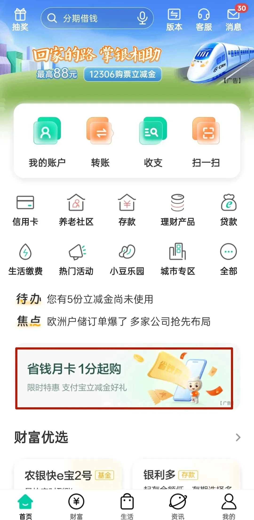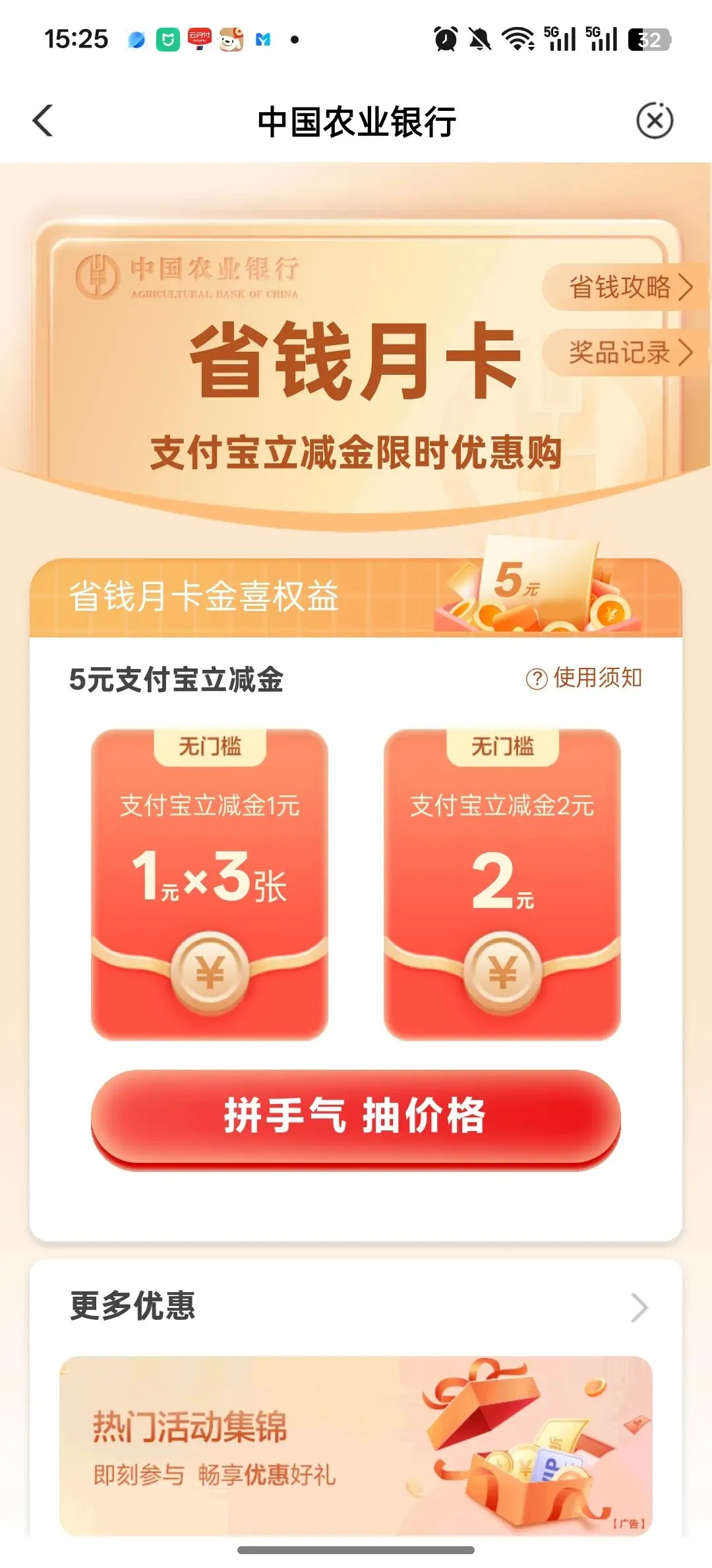 >[农行福利]0.5元抵5元