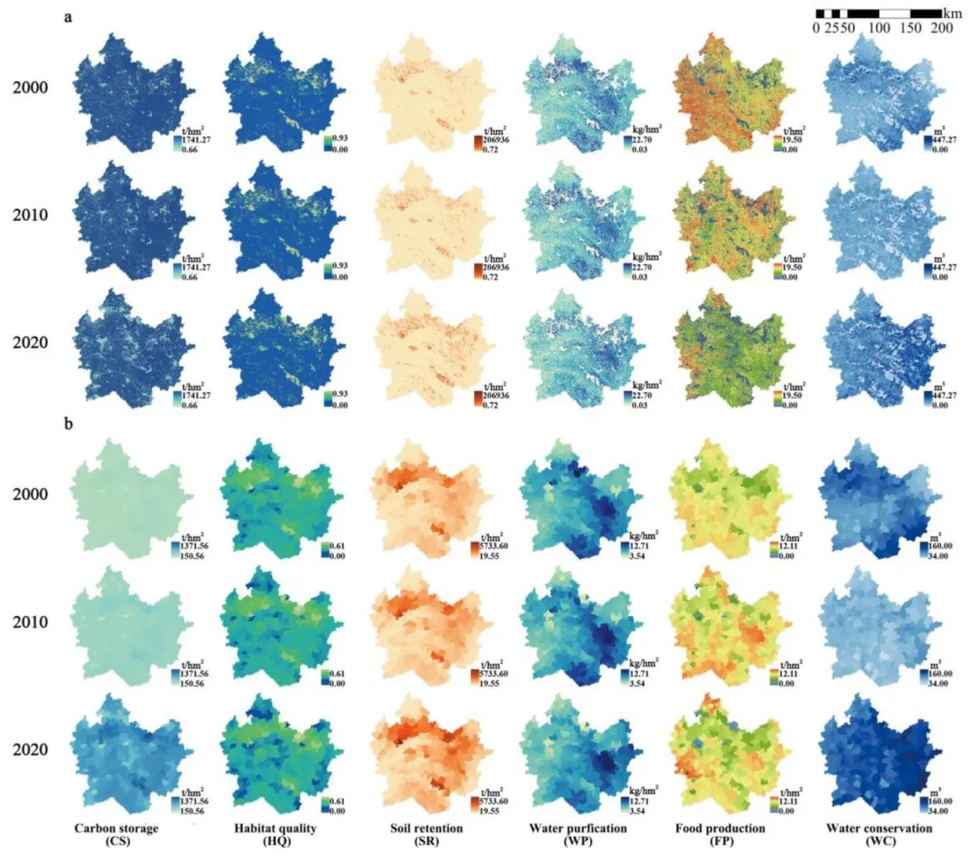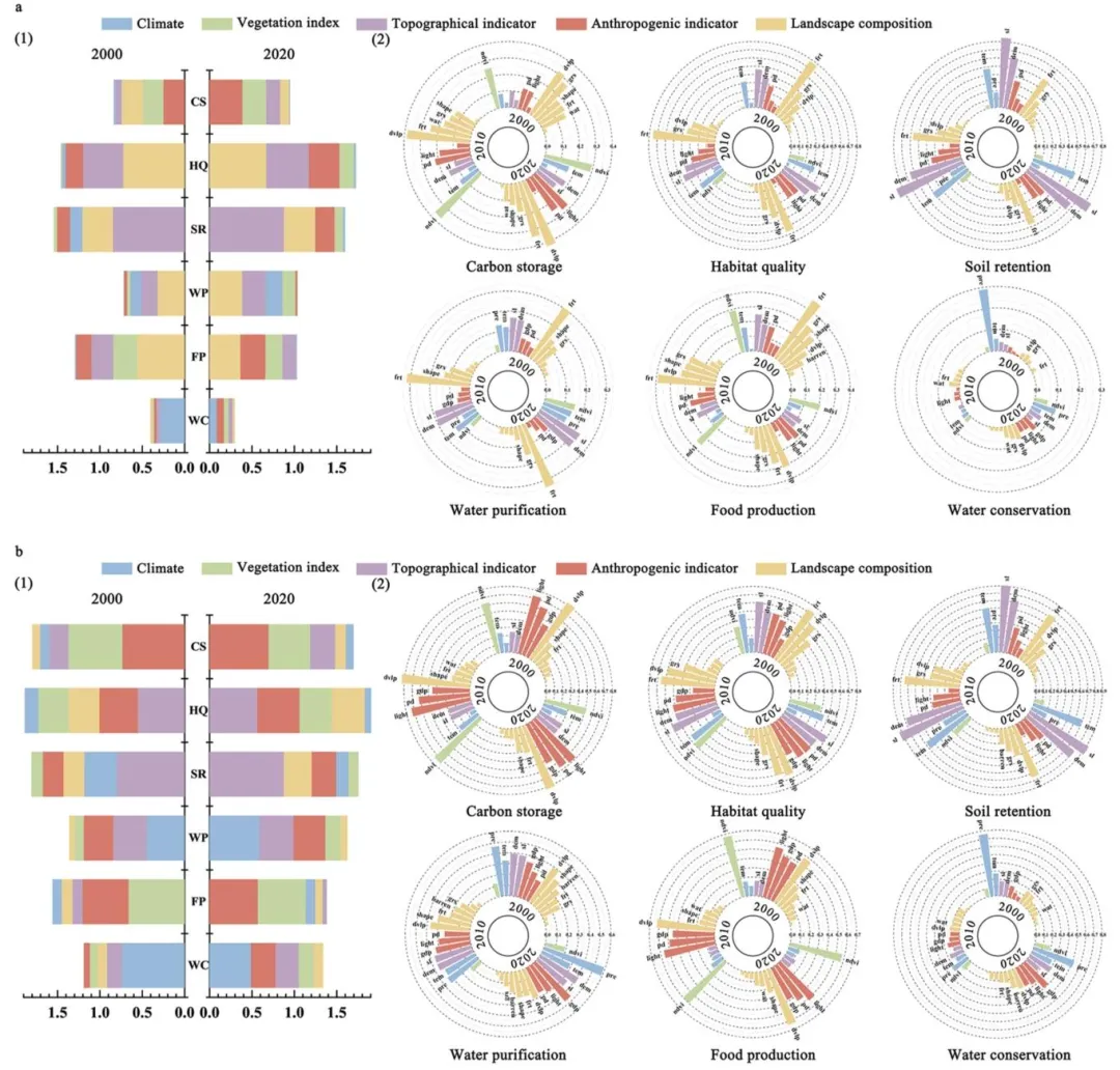 (1)量化2000-2020年6类关键生态系统服务(栖息地质量、土壤保持、水质净化、碳储存、食物生产、水源涵养)的时空动态变化;