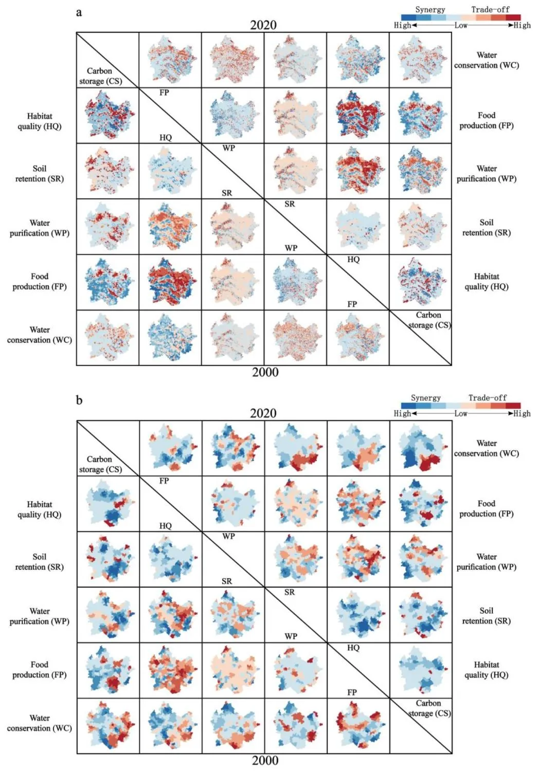 了解生态系统服务(ES)的相互作用,特别是在快速城市化背景下它们如何向丘陵地区变化和转移,并分析这些相互作用在不同尺度上的差异和驱动机制,是实施有效的多尺度生态系统管理的基本前提。 本研究通过多尺度分析框架探讨了快速城市化丘陵地区生态系统的动态相互作用。 以山东中南部丘陵地形为研究对象,系统量化了2000-2020年6个生态系统,包括生境质量(HQ)、土壤保持(SR)、水净化(WP)、碳储量(CS)、粮食生产(FP)和水资源保持(WC)。