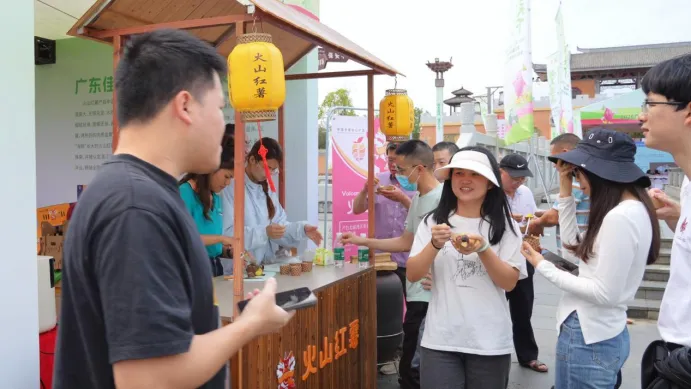 同步开启的 “广货行天下・遂溪优品展春季行动” 中,火山红薯展位人气爆棚。刚蒸熟的火山红薯香甜软糯,富含多种微量元素,引得嘉宾、市民争相试吃点赞。工作人员现场讲解品种优势与产品体系,同步开启直播推介,线上线下掀起火山红薯热潮,其全产业链发展成果也成为展区亮点。