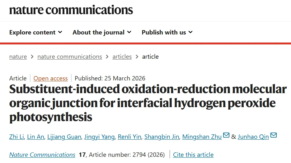 Substituent-induced oxidation-reduction molecular organic junction for interfacial hydrogen peroxide photosynthesis. Zhi Li, Lin An, Lijiang Guan, Jingyi Yang, Renli Yin, Shangbin Jin, Mingshan Zhu* & Junhao Qin*. Nat Commun 17, 2794 (2026).