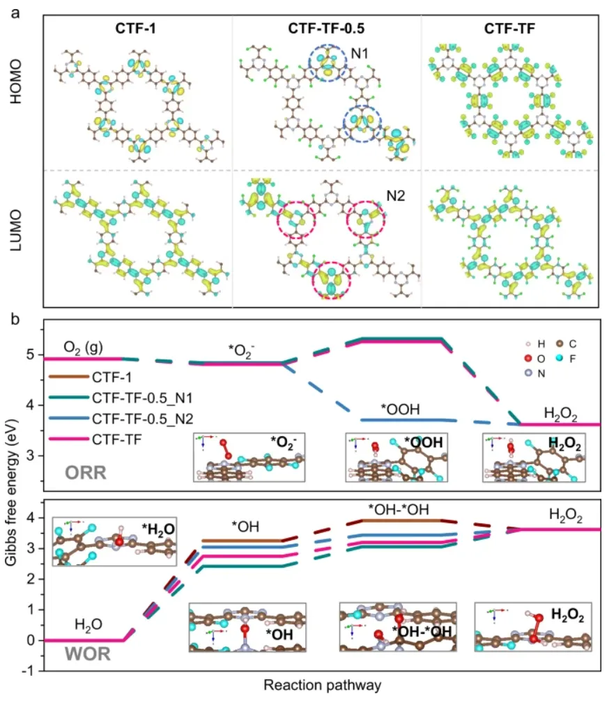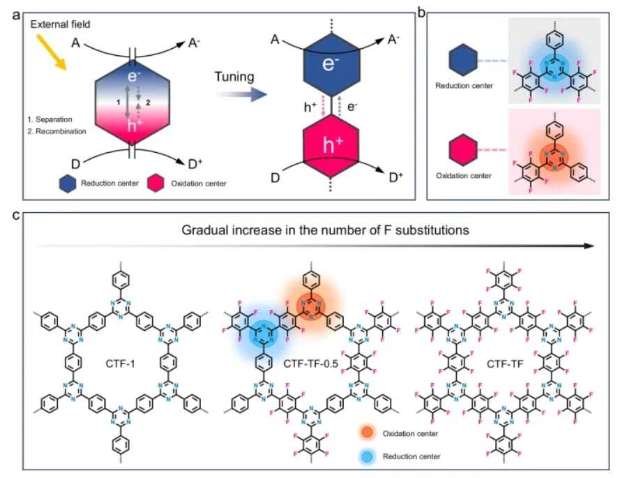 催化活性位点的分布对光催化效率起着决定性作用,然而现有催化剂设计多采用同一位点或邻近位点的反应模式,在光催化反应中仍存在局限。为解决这一问题。华南农业大学秦俊豪教授、暨南大学朱明山教授团队合作构建了一类具有空间可分离氧化还原位点的氟取代分子有机结催化剂(共价三嗪骨架材料,CTF-TF-0.5)。通过调控氟取代苯连接单元的配位方式,我们实现了对共价三嗪骨架中三嗪环氧化还原性质的精准控制,从而获得可分离的氧化还原位点分配。该催化剂在模拟太阳光与超声作用下,于三相界面实现了4664 μmol·g⁻¹·h⁻¹的过氧化氢光合成速率。在外场作用下,光生空穴经苯桥传递至氧化位点(连接两个苯环与一个氟取代苯环的三嗪单元),光生电子则传递至还原位点(连接一个苯环与两个氟取代苯环的三嗪单元),通过水氧化与氧还原双反应路径协同生成过氧化氢。此外,该多相界面反应体系对含砷矿山废水也表现出高效的净化能力。该研究利用可分离的氧化还原位点,在可控活性位点上解决了反应耦合问题,为通过分子有机结催化剂提升整体催化效率提供了新思路。