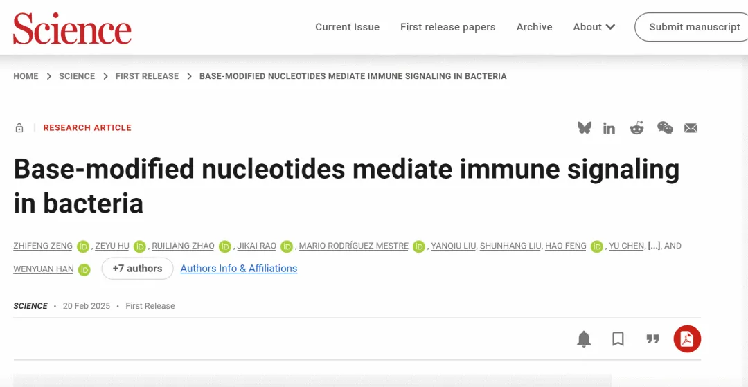 韩文元教授团队在国际顶尖学术期刊《Science》发表了题为“Base-modified nucleotides mediate immune signaling in bacteria”的研究论文,不仅发现了一种全新的细菌抗噬菌体免疫机制,受“草船借箭”典故的启发,更将其形象地命名为“孔明系统”(Kongming)。这一发现巧妙地借用噬菌体自身的成分来激活免疫反应,为我们理解微观世界中微生物间的生存博弈开辟了全新的视角。