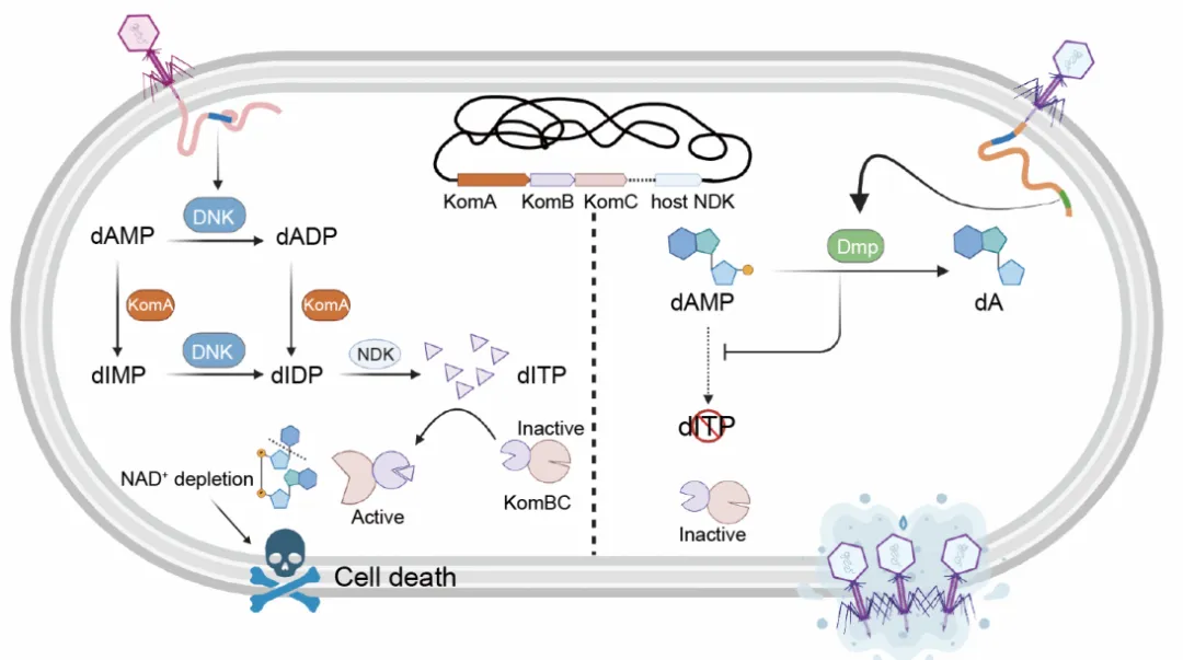 通过深入的基因分析,研究团队锁定了一个由三个基因组成的操纵子,分别编码腺苷脱氨酶(KomA)、HAM1样非典型嘌呤NTP焦磷酸酶(KomB)以及含SIR2样结构域的蛋白(KomC)。这套系统的运作机制堪称微生物界的“孙子兵法”:当噬菌体入侵时,其携带的脱氧核苷酸激酶(DNK)本是为了自身复制,却意外成为了激活细菌免疫的“开关”。