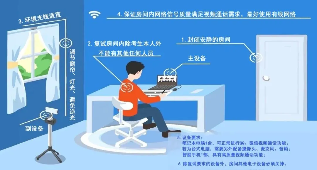选择独立房间独自参加网络远程复试,面试期间房间安静明亮,桌面整洁清爽,严禁他人进入房间,不得出现可能影响正常复试的声音。