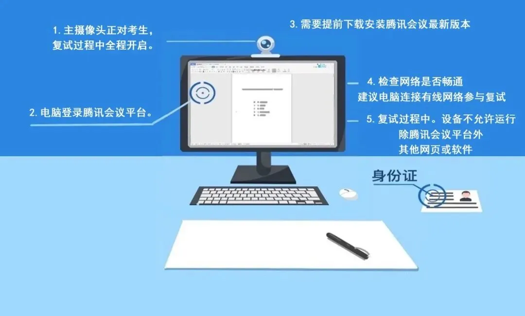 (九)按线上秘书指令双手分持身份证和准考证,举至与颈部同高处,接受身份核验。复试中按线上秘书指令转换视频画面,接受对桌面物品和房间环境巡查。