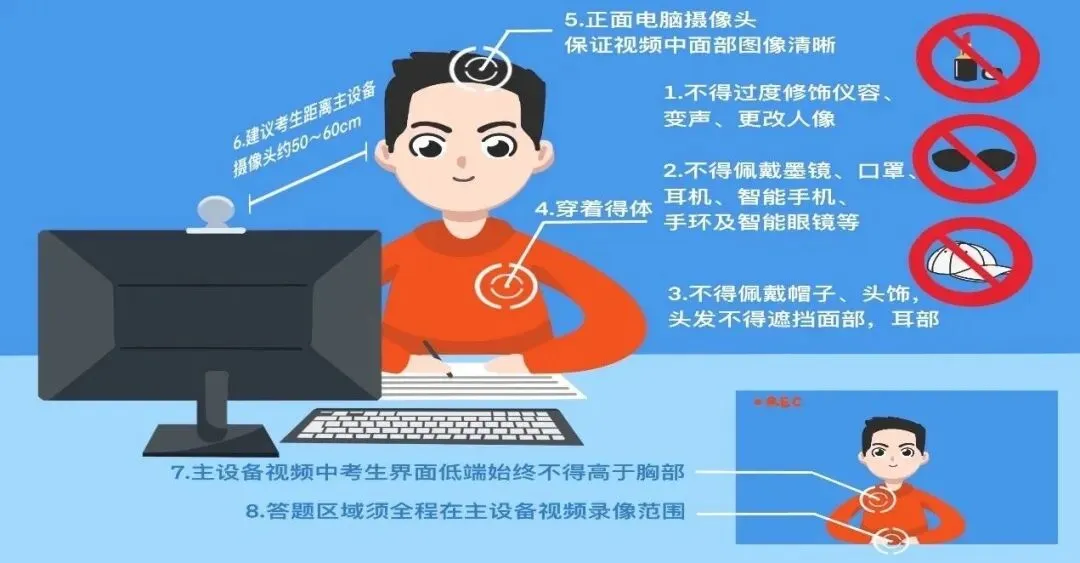 坐姿端正,衣着得体,五官显露。座位与电脑之间距离以视频画面能显示人体上半身和双手为宜。