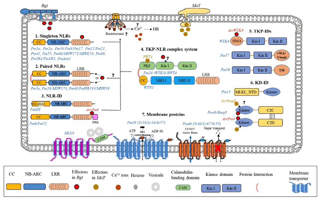 小麦白粉病是由禾本科布氏白粉菌小麦专化型(Blumeria graminis f. sp. tritici, Bgt)引起的真菌病害,是全球小麦生产中最具破坏性的病害之一。培育和推广抗病品种是防控该病害最为经济、有效的策略。经过数十年的系统研究,科研人员已从小麦及其野生近缘种中正式命名了71个抗白粉病基因(Pm基因),其中24个已被成功克隆。这些基因编码的蛋白在结构上高度多样,其作用机制也呈现出复杂性和多样性。