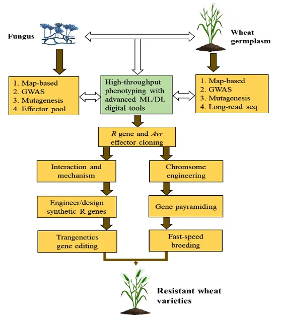 整合先进的基因组学与基因编辑工具,对于将源自野生近缘种的R基因高效导入优良作物品种至关重要。借助机器学习、高通量表型分析及前沿测序技术,可快速从种质资源中筛选、鉴定并验证抗性基因。利用图位克隆、全基因组关联分析、突变体筛选、长读长测序技术以及效应因子文库筛选等手段,能够显著加速R基因及其无毒基因(Avr)的克隆进程。深入解析R蛋白与无毒蛋白(R-Avr)的互作机制,将为R基因的工程化改造与设计育种提供新思路。通过基因工程技术改造R基因,使其能够特异性识别病原菌中多个保守效应因子,已成为实现作物广谱抗病性的前沿方向(图2)。此外,结合染色体工程、基因工程及基因聚合育种策略,可有效推动抗病基因在作物改良中的应用。