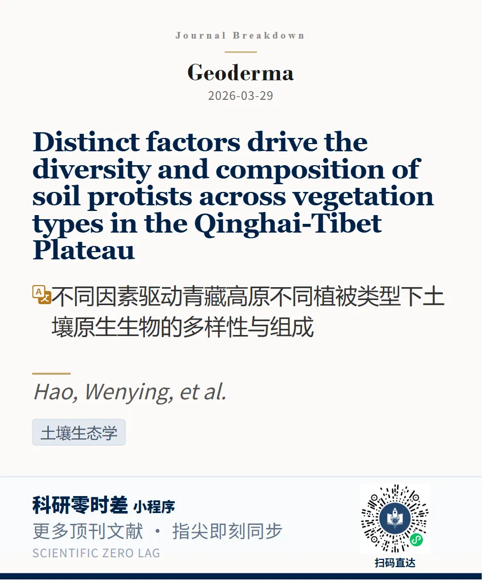 我们通过小程序科研零时差追踪到: Geoderma近期发表题为“Distinct factors drive the diversity and composition of soil protists across vegetation types in the Qinghai-Tibet Plateau”的文章。第一单位为中国农业大学。
