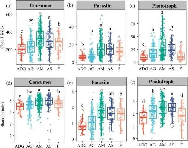 ▲Figure 1. The α-diversity of protist functional groups: consumer (a, d), parasite (b, e) and phototroph (c, f).