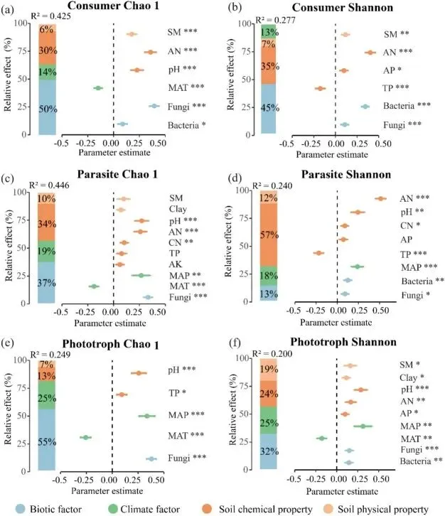 - • 结论 2: 不同功能群的驱动机制存在显著分化。消费者和光养者的多样性受生物(细菌和真菌多样性)与非生物因素的共同驱动;而寄生者的多样性则表现出强烈的环境过滤特征,主要受降水、土壤水分和碳氮比等非生物化学因素驱动。