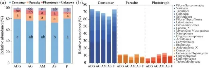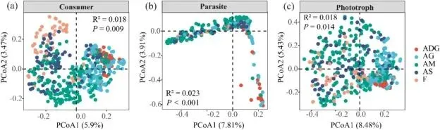 ▲Figure 3. Principal coordinates analysis (PCoA) based on Bray– Curtis dissimilarity showing the β-diversity patterns of protist functional groups.